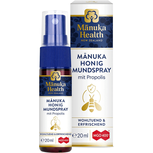 Manuka Propolis Mundspray MGO 400+ Manuka Health. Manuka Propolis Mundspray MGO 400+ von Manuka Health Das Mundspray von Manuka Health enthält MGO 400+ Manuka Honig und neuseeländische Propolis. Ergänzt wurde das Spray noch mit wertvollem Pfefferminz-, Anis-, Myrrhe- und Nelkenöl. Die natürlichen Inhaltsstoffe unterstützen die Mundhygiene und beruhigen und schützen gleichzeitig auch Mund und Rachen. Ideal für unterwegs, auch als kleine Atemerfrischung. Natürliche Mund- und Rachenpflege.