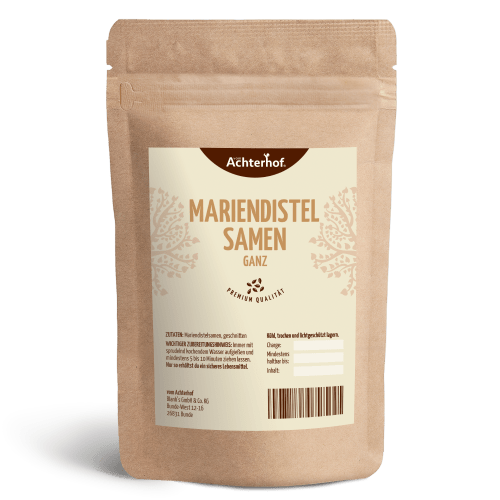 Mariendistelsamen ganz vom Achterhof. Mariendistelsamen kaufen Die Mariendistel wurde als Kraut eher spät entdeckt, wobei sie in der Küche schon im frühen Mittelalter Verwendung fand! Im Altertum galt die Mariendistel als Gemüsepflanze, die im gekochten oder rohen Zustand verzehrt und zum Würzen verwendet wurde. Die heilige Hildegard von Bingen entdeckte die Mariendistelsamen für die Kräuterkunde als erste und zeigte auch damit, dass sie ihrer Zeit weit voraus war. Aus den Mariendistelsamen werden in erster Linie Tinkturen und Essenzen zubereitet, da der Tee sehr bitter ist und Du ihn nur schwer trinken kannst. Nur die Mariendistelsamen selbst werden für Tees oder Tinkturen verwendet und mit siedendem Wasser übergossen. Die Samen sollten vor der Zubereitung zerstossen und der Aufguss anschließend etwa 10 bis 15 Minuten ziehen gelassen werden. Mariendistelsamen enthalten einen bisher unbekannten Stoff mit angenehmer Schärfe. Mariendisteltee Stören Dich Bitterkeit und leichte Schärfe nicht, ist ein Mariendistelsamen Tee richtig für dich. Die bei uns erhältlichen Mariendistelsamen stammen aus kontrolliert Anbau, werden sorgfältig geerntet und anschließend langsam und schonend getrocknet. Durch den umsichtigen Umgang beim Anbau, der Ernte und Trocknung bleiben die wertvollen Inhaltsstoffe im Mariendistelsamen in vollem Umfang enthalten. Nicht alle Ingredienzien sind wasserlöslich, wodurch sich ein Tee nicht in jedem Fall eignet und genau die Inhaltsstoffe im Samen binden kann, auf die Du Wert legst. Neben Tees und Aufgüssen werden Mariendistelsamen auch in Kräuterlikören verwendet. Mit unseren Mariendistelsamen wählst Du ein vielseitig verwendbares Naturprodukt dessen Inhaltsstoffe in der Kräuterkunde und neuzeitlichen Küche vielseitig einsetzbar sind. Mariendistel wurde in der Antike hochgepriesen. Auch die heilige Die heilige Hildegard von Bingen entdeckte die Mariendistelsamen für ihre Kräuterkunde. Der Name der Mariendistel entstammt einer alten Legende, nach der die weißen Streifen auf ihren Blättern von der Milch der Jungfrau Maria stammen.
