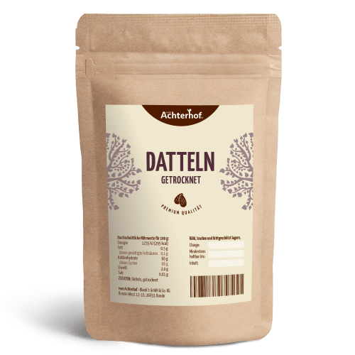 Medjool Datteln getrocknet vom Achterhof. Königsdatteln natürlich unbehandelt Bei unseren unbehandelten Datteln handelt es sich um die Königsdatteln. Die Medjool Datteln wird auch als die Königsdattel gesehen – und das nicht ohne Grund: sie ist besonders weich, saftig, von Natur aus angenehm süß und schmeckt fast wie Karamell. Ein echtes Geschmackserlebnis! Ideal als Dessert oder Snack für zwischendurch aber auch für viele orientalische Gerichte kann sie super verwendet werden. Überzeuge dich selbst von diesem cremig süßen Geschmack!