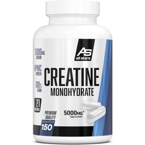 Mega Caps Creatin Kapseln von All Stars. Mega Caps Creatin von All Stars 3g Kreatin pro Tag erhöhen die körperliche Leistung bei Schnellkrafttraining im Rahmen kurzzeitiger intensiver körperlicher Betätigung und unterstützen den Muskelaufbau. Die Mega Caps enthalten je Kapsel 1000mg Kreatinmonohydrat. Kreatin-Monohydrat ist besonders beliebt bei Kraftsportlern und Fitnessathleten, wird aber auch von zahlreichen anderen Sportlern z.B. aus Fußball, Tennis, Handball oder Leichtathletik genutzt. Je 5 Kapseln bilden eine Portion und liefern damit 5000mg hochwertiges Kreatin. Zusätzlich sind nur die Zutaten für die gelatinefreie Kapselhülle im Produkt enthalten. Die Kapseln lassen sich leicht schlucken, einfach dosieren und bequem transportieren. Die tägliche Einnahme sollte zum Frühstück oder rund ums Training mit ausreichend Flüssigkeit erfolgen. Hochreines Creatin Monohydrat in Kapselform!