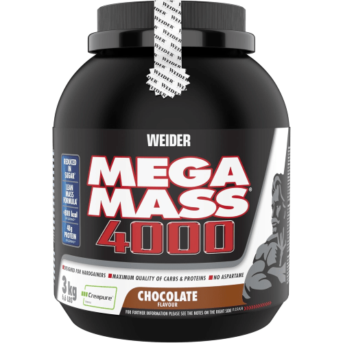 Mega Mass 4000 Pulver von Weider mit Schokolade Geschmack in der 3KG Packung. Weider – Mega Mass 4000 Das Pulver in den verschiedensten Geschmacksrichtungen liefert reichlich Nährstoffe für den Muskel- und Masseaufbau. Mega Mass 4000 – Vorteile auf einen Blick für effektiven Aufbau von Kraft und Masse mit Kreatin und hochwertiger Stärke Mix aus Kohlenhydraten und Protein Zusatz von Vitaminen und Mineralien mit CREAPURE 1 Portion hat bis zu 845 kcal (49g Eiweiß und 128g Kohlenhydrate und nur 14 g Fett) enthält BCAAs, Glutamin und Arginin in leckeren Geschmacksrichtungen verfügbar Mega Mass 4000 – was ist das, und was bringt mir das? Mega Mass 4000 ist eine Kohlenhydrat-Proteinmischung mit zugesetzten Mikronährstoffen und Kreatin.Damit liefert Mega Mass 4000 neben der Kombination aus Kreatin und hochmolekularer Stärke eine Drei-Komponenteneiweißmischung aus Milch (Isolat), Molke (Isolat) und Eiklarprotein. Diese enthält alle wichtigen Aminosäuren, darunter BCAA’s, Glutamin und Arginin, und unterstützt den Aufbau von Muskelmasse. Die Rezeptur ist 100% aspartamfrei! Mega Mass 4000 von Weider – für wen geeignet? Mega Mass richtet sich in erster Linie an Athleten, Kraftsportler und Bodybuilder, die das Ziel haben Masse aufzubauen. Für die Masseaufbauphase liefert dieses Produkt einen effektiven Nährstoff-Mix, um schnelle Erfolge zu erzielen, und ist damit besonders für Hardgainer interessant. Auch für Deine nächste Kraftaufbauphase ist dieses Produkt ideal. Seit vielen Jahren gehört Weider Mega Mass 4000 zu den erfolgreichsten und beliebtesten Weight Gainern weltweit! Wie wird Mega Mass 4000 verwendet? Mische für ein Portion 150g Pulver in 550ml fettarme Milch oder Wasser.Du kannst täglich eine Portion Weider Mega Mass 4000 je nach Protein- und Kreatinbedarf nutzen, vorzugsweise an Trainingstagen nach dem Training oder an Nicht-Trainingstagen nach dem Aufstehen. Ideal für die nächste Massephase.