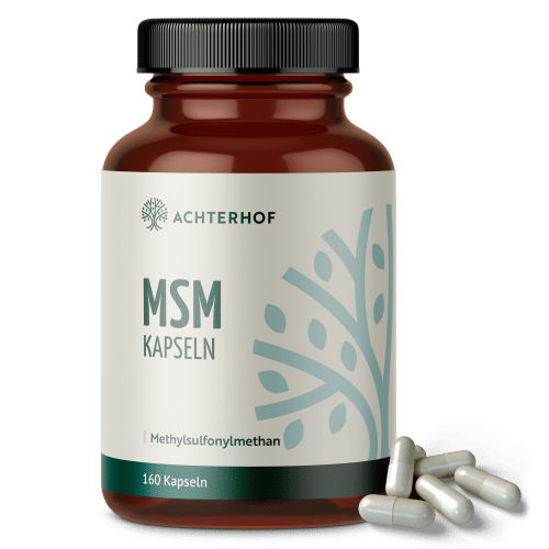 MSM Kapseln von vom Achterhof. MSM (Methylsulfonylmethan) ca. 160 Kapseln Was ist MSM ? MSM ist die Abkürzung für Methylsulfonylmethan und bedeutet organischer Schwefel. Organisch, da er aus natürlich vorkommenden Quellen gewonnen wird. Die Notwendigkeit den Körper mit ausreichend Magnesium und Eisen zu versorgen ist allgemein bekannt. Aber Schwefel? Schwefel ist ein unverzichtbarer Bestandteil unseres Körpers. Er benötigt beispielsweise fünfmal mehr Schwefel als Magnesium und sogar 40 mal mehr als Eisen! Natürlicherweise ist Schwefel in vielen eiweißhaltigen Nahrungsmitteln enthalten, zum Beispiel in Eiern, Milchprodukten, Fleisch, Fisch, aber auch in Nüssen, Knoblauch, Bärlauch und Zwiebeln. Durch Erhitzen oder Kochen wird der Schwefel aber meist gänzlich zerstört. Eine Aufnahme von organischem Schwefel ausschließlich über die Nahrung ist daher nicht immer gewährleistet. Unsere Kapseln enthalten 99,9 % reines, hoch bioverfügbares und sehr feines Methylsulfonylmethan. Es besteht zu 34 % aus reinem Schwefel und ist somit ein hochkonzentrierter natürlicher Lieferant dieses lebenswichtigen Mineralstoffs. Methylsulfonylmethan (MSM) bedeutet organischer Schwefel und ist ein essenzieller Bestandteil unseres Körpers. Die hochkonzentrierten und bioverfügbaren MSM Kapsel garantieren für eine ausreichende und einfache Einnahme des lebenswichtigen Mineralstoffs.