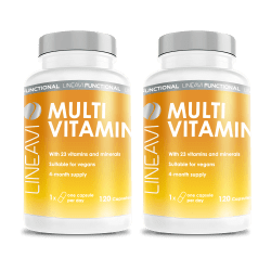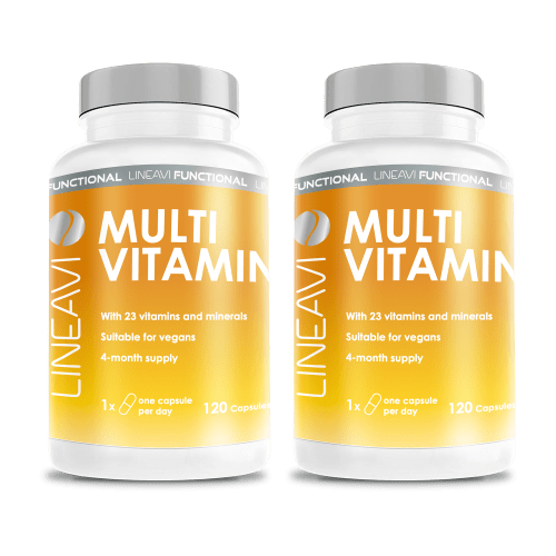 Multivitamin 8-Monatspackung Kapseln von LINEAVI. Einfach täglich – und du bist bestens versorgt Nimm einfach eine Kapsel mit etwas Wasser – fertig! Eine Packung enthält 120 Kapseln und versorgt dich so für ganze 4 Monate. Ob im stressigen Alltag oder als Ergänzung zu einem gesunden Lebensstil: LINEAVI Multivitamin unterstützt dich dabei, rundum gut versorgt zu sein – Tag für Tag. Mit nur einer LINEAVI Multivitamin-Kapsel pro Tag tust du dir und deinem Körper etwas Gutes – ganz einfach und ohne Aufwand. Insgesamt 23 wertvolle Vitamine und Mineralstoffe stecken in jeder Kapsel und unterstützen dich in deinem Alltag: Enthalten sind unter anderem die Vitamine A, C, D, E, K sowie alle wichtigen B-Vitamine. Dazu kommen Mineralstoffe wie Calcium, Magnesium, Eisen, Zink, Jod, Selen und weitere Spurenelemente, die viele wichtige Prozesse im Körper begleiten. Unsere durchdachte Formel versorgt dich gezielt mit wichtigen Vitaminen und Mineralstoffen – damit dein Körper bekommt, was er braucht. Ein Mangel kann schnell deine Energie und dein Wohlbefinden beeinträchtigen. LINEAVI Multivitamin hilft dir, solchen Engpässen vorzubeugen und unterstützt dich dabei.