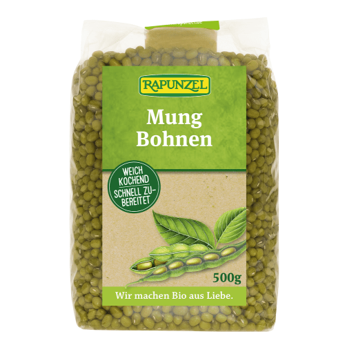 Mungbohnen bio Rapunzel. Abwechslung für die gesunde Küche! Eco control number: DE-ÖKO-006 Mungbohnen von Rapunzel sind eine Spezialität aus China. Die Bohnen werden, nachdem sie geerntet wurden, sorgfältig gereinigt, nach höchsten Qualitätskriterien sortiert, schonend getrocknet und am Ende des Verarbeitungsprozesses poliert. Es wird dabei darauf geachtet, dass die wertvollen Inhaltsstoffe weitgehend erhalten bleiben. Die Mungbohnen haben ein dezent süßliches Aroma und ihre Einweichzeit ist außerordentlich kurz. Du kannst sie für Suppen, Wok-Gerichte, indische Rezepte und auch für die kalte Küche exzellent verwenden.