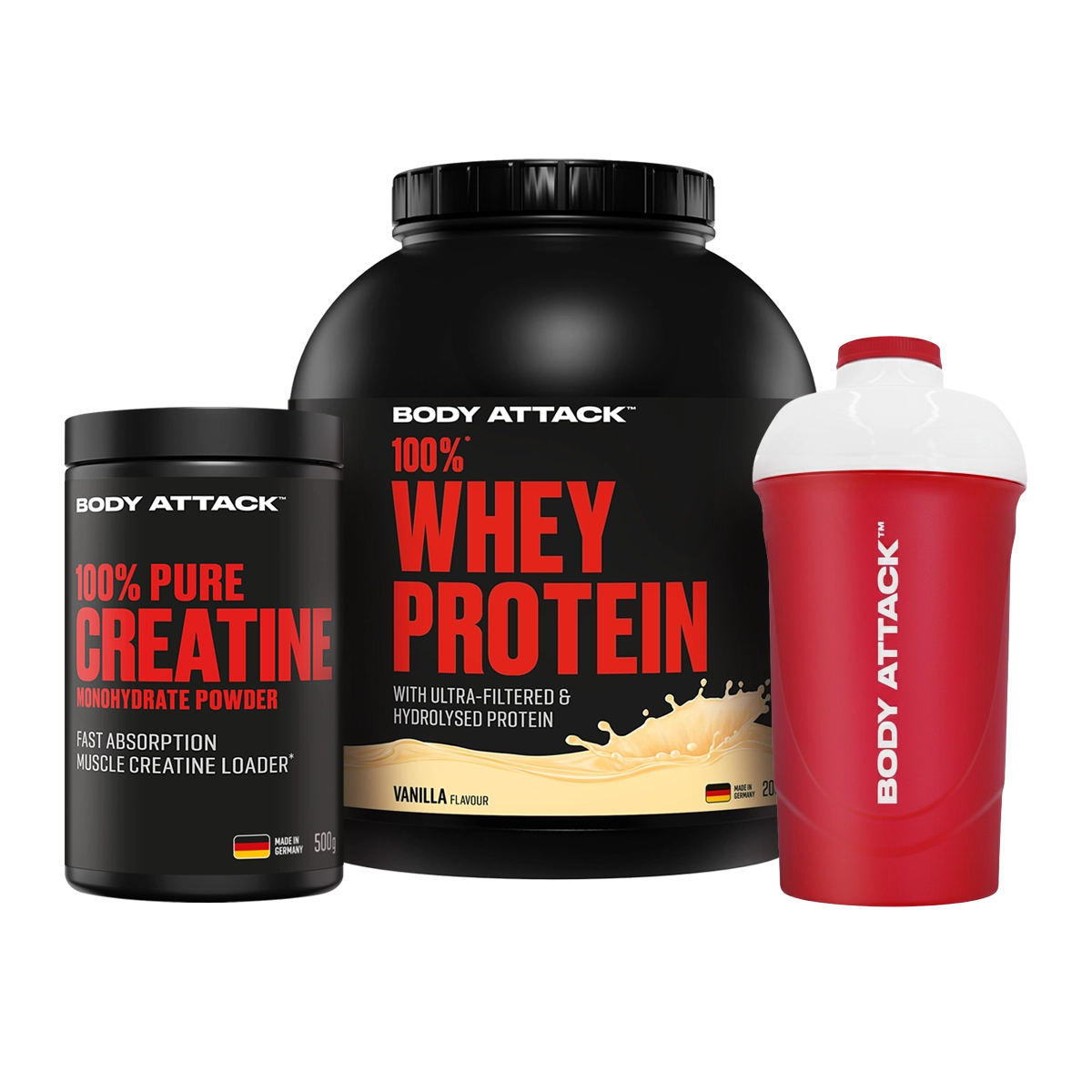 Du möchtest dein Muskelwachstum vorantreiben? Ein definierter Körper ist schon immer dein Traum? Dieses Eiweiß kitzelt deine Motivation aus dir heraus! Das hochwertige WHEY PROTEIN besteht aus ultrafiltriertem reinem WHEY PROTEIN Konzentrat und Hydrolysat. Der hohe BCAA-Anteil sowie der satte Proteingehalt kurbeln den Muskelaufbau ordentlich an. Die schnelle Löslichkeit und der cremig leichte Geschmackmachen das 100 % WHEY PROTEIN zum „Must-Have“ für deine Mission: Traumkörper! 100 % WHEY PROTEIN – 100 % volle Eiweiß-Power Zur Unterstützung der folgenden Ziele ist das 100 % WHEY PROTEIN die perfekte Wahl: Muskel-Definition Muskelaufbau und Muskelerhalt Deckung eines erhöhten Proteinbedarfs Low-Carb und Low-Fat Diäten Für wen ist das 100 % WHEY PROTEIN geeignet? Fitness-Sportler Athleten Ausdauer- und Spielsportler Figurbewusste Personen und Diätwillige Personen mit Proteindefizit Warum Whey? – Hier steckt dein nächstes Workout drin In deinen Eiweiß Shake gehört nur bestes Proteinpulver: Das WHEY PROTEIN. Aber warum? Es ist eine von zwei Proteinarten Whey und Casein und wird aus Molke gewonnen. Dieses Eiweiß punktet mir seiner besonders hohen biologische Wertigkeit. Heißt: Es werden mehr Proteine in deinem Körper umgewandelt, die dir beim Aufbau deiner Muskulatur helfen. Von allen Eiweißen wird Whey vom Körper am schnellsten aufgenommen. Und wir setzen sogar noch einen drauf! Neben reinem Whey Konzentrat besticht das 100 % WHEY PROTEIN durch zusätzliches Hydrolysat. Einfach gesagt: „aufgespaltenes Protein“. Dein Benefit? Das Eiweiß wird noch schneller verwertet – also ein echter Volltreffer für dein Ziel Muskelaufbau! Zeit fürs Muskelwachstum! Die perfekte Einnahme von WHEY PROTEIN Das harte Power-Workout ist geschafft? Perfekt! Jetzt sehnt sich deine Muskulatur nach den nötigen Nährstoffen. Ein fix zubereiteter 100 % WHEY PROTEIN Shake ist genau das Richtige. Spätestens eine halbe Stunde nach dem Training sollte der cremige Genuss durch deinen Gaumen fließen, damit deine harte Arbeit bestens in Muskelmasse umgesetzt werden kann. Auch vor dem Training hat das WHEY PROTEIN einen Auftrag: Es versorgt dich bereits während höchster Leistungen mit Eiweiß. Mit dem 100 % WHEY PROTEIN bist du immer auf der richtigen Seite. Eiweiß: Dein Muskel- und Organantrieb Was ist Eiweiß? Klar ist, ohne Eiweiß geht bei uns gar nichts. Denn Proteine oder auch Eiweiß genannt , sind an der Stabilisierung von Gewebe, Organen und unserem Immunsystem beteiligt. Wie viel Eiweiß darfst du über die Nahrung aufnehmen bzw. hilft dir beim Ziel Muskelaufbau? Die „International Society of Sports Nutrition“ empfiehlt pro Tag 1,6 bis 2 Gramm Protein pro Kilogramm Körpergewicht. Bei einem 80 kg schweren Mann wäre der Eiweißbedarf bei 160 g aufs Maximum gedeckt. BCAA’S – Die Muskelmacher Sie sollten eigentlich als die drei Musketiere der Muskelerhaltung bekannt sein. Stattdessen sind es Leucin, Isoleucin und Valin. Genau diese BCAA’s branched-chain amino acids oder auch zu deutsch verzweigtkettige Aminosäuren genannt, erfüllen zahlreiche lebenswichtige Funktionen im menschlichen Stoffwechsel und sind wichtiger Bestandteil der Muskeln. Essenzielle Aminosäuren können wir lediglich über die Nahrung aufnehmen. Besonders Leucin kurbelt den Muskelaufbau an. Deshalb findest du im 100 % WHEY PROTEIN davon einen höheren Anteil – im idealen Mischverhältnis von 2:1:1 Leucin zu Valin zu Isoleucin . Genau diese Ratio ist ideal für die Förderung deiner Muskeln. Wheypep – schnellstes Whey Hydrolysat für maximale Regeneration Wheypep ist ein hochentwickeltes Molkenprotein (Whey Hydrolysat), das speziell für Sportler und Fitnessenthusiasten entwickelt wurde, die ihre Muskeln nach dem Training optimal versorgen möchten. Durch die Aufspaltung in kurze Peptide wird das Protein besonders schnell vom Körper aufgenommen, wodurch die essenziellen Aminosäuren direkt den Muskeln zur Verfügung stehen. So unterstützt Wheypep nicht nur die schnelle Regeneration, sondern auch den Muskelaufbau, die Leistungsfähigkeit und die Reduzierung von Muskelkater nach intensiven Workouts. Anders als herkömmliches Whey-Protein ist Wheypep leicht verdaulich, belastet den Magen nicht und kann auch direkt nach dem Training oder in stressigen Trainingsphasen eingesetzt werden, wenn die Muskeln besonders schnell Nährstoffe benötigen. Kölner Liste® – Sicher, Sauber, Stark! Du willst volle Power, aber auf Nummer sicher? Dann check unsere Produkte auf der Kölner Liste®! Die Kölner Liste ist DIE Plattform für geprüfte Sportnahrung, die auf verbotene Substanzen getestet wurden. Keine versteckten Risiken, keine bösen Überraschungen – nur pure Performance. Egal ob Supplements, Snacks oder Drinks: Was hier gelistet ist, wurde unabhängig geprüft und gibt dir das gute Gefühl, alles richtig zu machen und clean zu trainieren. Viele unserer Produkte tragen dieses Siegel mit Stolz. Und es kommen immer mehr Neue dazu! Maximal-Kraft voraus! Ob beim finalen Sprint oder bei der letzten Wiederholung im Workout. Kitzle mit unserem 100 % PURE CREATINE Powder genau die Steigerung heraus, die deine Bestleistung toppen wird. Nicht nur sauber sondern rein! Unser mikrofeines Kreatin Monohydrat hält, was es verspricht. Einhundert Prozent hoher Reinheitsgrad ohne weitere Zusätze. Das Pulver löst sich sehr gut in Fruchtsaft oder Wasser auf, um dich dir bei deinen Muskelaufbau-Zielen nach vorn zu bringen. 100 % Pure Creatine – Erreiche Deine Ziele Für die Unterstützung folgender Ziele ist das 100 % PURE CREATINE die beste Wahl: Kraftzuwachs Intensivere Trainingseinheiten Muskulatur erhalten Schnellere Regeneration Für wen ist 100 % PURE CREATINE geeignet: Fitness-Sportler Athleten Kraftsportler Ausdauer- und Spielsportler Personen, die an Gewicht zunehmen möchten Unser 100 % Pure Creatine – dein kristallklarer Benefit Bei der Supplementierung von Kreatin hat jeder Athlet kristallklare Vorte