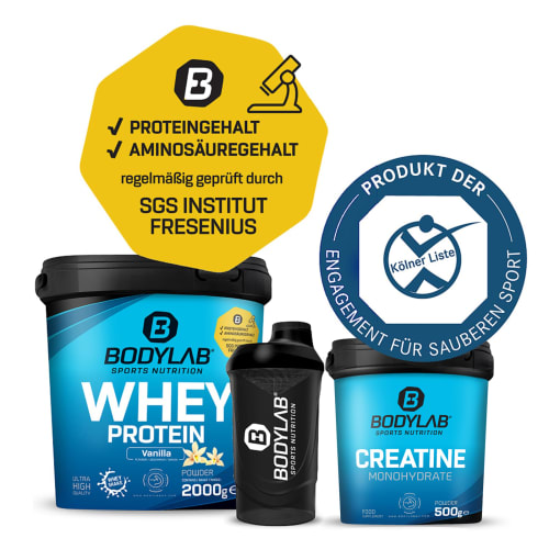 Muskelaufbau Deal Bodylab24. Whey Protein von Bodylab24 – unser absoluter Topseller im Geschmack Vanille Das Beste der Milch in Deinem Shaker – jetzt auch im Protein- und Aminosäuregehalt wissenschaftlich vom SGS INSTITUT FRESENIUS bestätigt. Hochwertigstes Whey Protein (Molkenprotein) von Bodylab versorgt Dich mit wichtigen Eiweißbausteinen, den Aminosäuren. Whey ist dabei ein ideales Proteinprodukt zur Nutzung direkt im Anschluss an eine körperliche Belastung, z.B. nach einem intensiven Kraft- oder Ausdauertraining. Die Proteinsynthese wird angeregt, die Regeneration unterstützt, Dein Körper erhält wichtige Eiweißbausteine zum Muskelaufbau und kann so langfristig kräftiger werden. Auch ideal zur Verwendung am Morgen, wenn der Körper ebenfalls schnell verfügbares Protein für seine Muskeln benötigt. Deine Vorteile: – leckerer, natürlicher Geschmack – bioaktives, ultrafiltriertes Whey – enthält alle Proteinfraktionen vollständig – hohe biologische Verfügbarkeit – keine unnötigen Zusatzstoffe – ohne Aspartam – geprüfte Qualität Creatine Powder von Bodylab24 – einige Infos zum Produkt: Creatine (auch Kreatin bzw. Creatin) zählt zu unseren absoluten Bestseller-Produkten und ist auch allgemein eines der beliebtesten Sport-Supplements, wenn die allgemeine Kraft- und Leistungsfähigkeit gesteigert werden soll.Es ist eine Verbindung aus den Aminosäuren Arginin, Glycin und Methionin und trägt zur Versorgung der Muskeln mit Energie bei. Zahlreiche Tests zur Wirkung von Creatine belegen die Möglichkeiten zur Leistungssteigerung durch eine gezielte Creatine-Einnahme und die Europäische Behörde für Lebensmittelsicherheit (EFSA) hat in einer Erklärung für Kreatin folgende Wirkungsweise offiziell anerkannt:“3g Creatine pro Tag erhöhen die körperliche Leistung bei Schnellkrafttraining im Rahmen kurzzeitiger intensiver körperlicher Betätigung“. Creatine ist nicht für Kinder und Jugendliche unter 18 Jahren geeignet. Die sichere Unterstützung für Dein Training – Whey Protein Vanille und Creatine Powder Unser Whey Portein Vanille wird regelmäßig als einziges Whey Protein in Deutschland vom bekannten SGS INSTITUT FRESENIUS hinsichtlich Protein- und Aminosäuregehalt überprüft. Unser Creatine Powder, aus 100% mikronisiertem Kreatinmonohydrat, ist jetzt auf der Kölner Liste geführt und enthält die Erfolgsformel für Energie, Kraft und Muskelaufbau. Die „Kölner Liste® führt Nahrungsergänzungsmittel (NEM) mit minimiertem Dopingrisiko“.Den Bodylab Shaker gibts on TOP.Die ideale Kombination für alle Athleten! Egal ob Profi oder Anfänger.