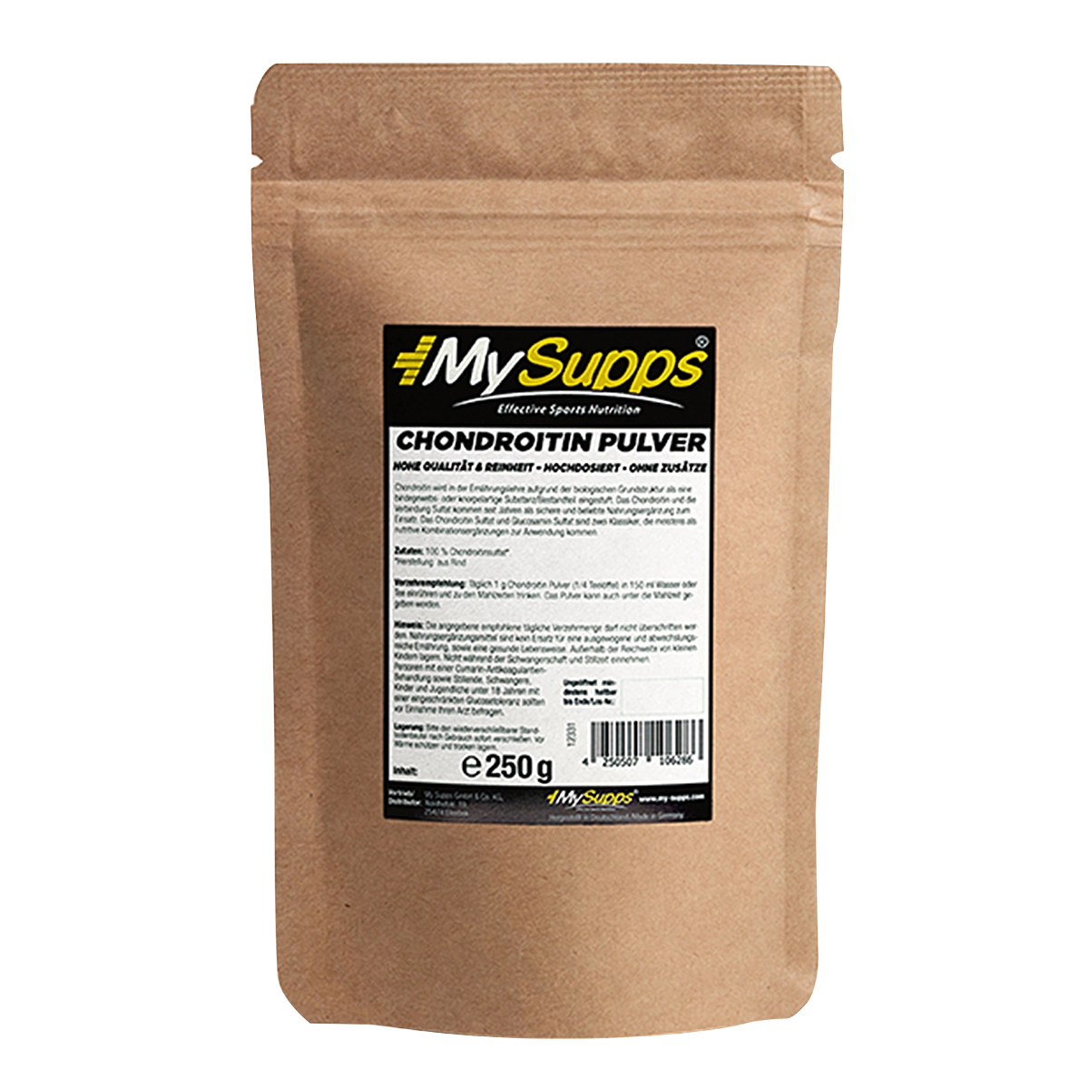 Deine Workouts bringen dich an dein Maximum? Die Hantel droht unter der Belastung zu zerbrechen? Bei so einem Druck brauchen deine Gelenke die bestmögliche Unterstützung! Das 100 % Chondroitinsulfat Pulver von My Supps! Das Pulver liefert dir hochdosiertes Chondroitin in Spitzenqualität – Made in Germany, versteht sich! Bereits 1 g des feinlöslichen Granulats genügen, um deine Knorpel und Gelenke für das nächste Workout optimal zu supporten! Auf Zucker, Süßstoffe oder sonstige Zusätze wird selbstverständlich verzichtet! So einfach geht Direktversorgung! Chondroitin – Support für deine Gelenke! Für die Unterstützung folgender Ziele ist Chondroitin die perfekte Wahl: Zur Unterstützung der Knorpel und Gelenke Ideal für die Regenerationsphasen Für wen ist Chondroitin geeignet? Fitness-Sportler Athleten Kraft- oder Ausdauer-Sportler Chondroitin – Stärke, die von Innen kommt! Damit du deine Workouts mit voller Belastung und hoher Intensität bewältigen kannst, müssen nicht nur deine Muskeln die erforderlichen Strapazen überstehen. Auch deine Knorpel und Gelenke werden gefordert und beansprucht. Um diese sensiblen Bereiche deines Körpers zu unterstützen, bietet dir My Supps 100 % reines Chondroitinsulfat als handliches Monoprodukt! Du willst mehr über das Supplement erfahren? Kein Problem! Was genau ist Chondroitin und wie wirkt es? Die Substanz Chondroitinsulfat oder auch einfach Chondroitin kommt von Natur aus in jedem menschlichen Körper vor und ist ein wichtiger Bestandteil der Knorpel, der Knochen und des Bindegewebes. Als Nahrungsergänzungsmittel wird Chondroitin als zusätzliche Unterstützung der Gelenke und Knorpel oder als Vorbeugung gegen Gelenkbeschwerden verwendet. Was wäre ein Haus ohne ein starkes Fundament, nicht wahr? Wie viel Chondroitin sollte man pro Tag einnehmen und wann? Eine Menge von 800 – 1200 mg Chondroitin wird pro Tag empfohlen. My Supps hat dir die optimale Rationierung bereitgestellt. Ganze 100 Portionen bekommst du in deinem Beutel Chondroitin! Nimm 1 g also 1000 mg Chondroitin vor einer Mahlzeit mit reichlich Wasser ein. Das Pulver löst sich leicht auf und hat eine hohe biologische Wertigkeit, wodurch es deinem Körper schnell zur Verfügung steht und sich direkt an die Arbeit machen kann! Unnötige Zusatzstoffe suchst du hier vergebens! Das nächste, hochintensive Workout kann kommen!