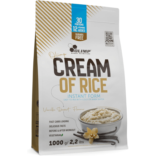 Olimp Cream of Rice Pulver von Olimp mit Vanilla Geschmack in der 1KG Packung. Olimp Cream of Rice – ein Fertiggericht Dieses Produkt (in Instantform) ist für Menschen gedacht, die Wert auf Bequemlichkeit legen. Die einfache Zubereitung ist einer der zahlreichen Vorteile von Olimp Cream of Rice. Es dauert buchstäblich nur einen Augenblick! Löse einen Messlöffel des Pulvers in kaltem oder warmem Wasser auf, und schon kannst du loslegen! Du brauchst dafür weder eine Mikrowelle noch kochendes Wasser, und die Konsistenz ist trotzdem genau richtig. Olimp Cream of Rice – schnelle Kohlenhydratversorgung Probiere diese einzigartig schmeckende Reiscreme aus, um deine Ernährung mit einer ordentlichen Portion komplexer Kohlenhydrate zu bereichern. Ideal vor und nach dem Training, wenn die Muskeln zusätzliche Energie für die Arbeit oder wertvollen „Treibstoff“ benötigen, wenn die Glykogenspeicher leer sind! Wir präsentieren Olimp Cream of Rice – eine leicht verdauliche Instant-Dessertcreme aus Reis mit zarter Textur. Einfach Wasser hinzufügen (heiß oder kalt) und los geht’s! Schnelle Kohlenhydratzufuhr garantiert! Wie bereitet man Olimp Cream of Rice zu? Es ist ganz einfach. Zubereitung der köstlichen Olimp-Reiscreme: eine Portion (33 g Pulver – 1 Messlöffel) abmessen, in ein Gefäß geben und 200 ml kaltes oder 250 ml warmes Wasser hinzufügen und kräftig umrühren, bis die richtige Konsistenz erreicht ist. Die Wassertemperatur sollte so gewählt werden, dass die Creme sofort nach der Zubereitung verzehrt werden kann. Diese Reiscreme von…