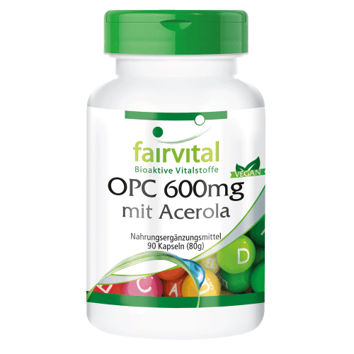 OPC 600mg mit Acerola Kapseln von Fairvital. OPC 600mg mit Acerola von Fairvital In diesem Nahrungsergänzungsmittel ist einerseits der Vitalstoff OPC in Form von Traubenkern-Extrakt und andererseits Vitamin C in Form von Acerola-Pulver enthalten. Dabei hat dieser Stoff vor allem einen günstigen Einfluss auf die Augen, den Blutkreislauf und die Haut. Die Abkürzung OPC steht übrigens für Oligomere Proanthocyanidine und gehört zu den sogenannten sekundären Pflanzenstoffen, genauer den Polyphenolen. Hochdosiertes Nahrungsergänzungsmittel mit Traubenkern-Extrakt und Acerola-Pulver.