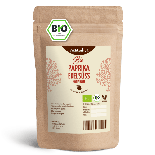 Paprika Edelsüss gemahlen Bio vom Achterhof. Paprikapulver Edelsüss – Mild würzig und aromatisch Paprikapulver Edelsüß wurde mit wenig Samen und ohne Rippen gemahlen. Er ist daher würzig mild mit scharfen Aromanoten. Wussten Sie ? Je dunkler das Paprikapulver desto milder ist es. Eco control number: DE-ÖKO-001 Edelsüßes Paprikapulver kann man für viele herzhafte Speisen verwenden. Anders als das Rosenscharfe Paprikapulver ist das edelsüße Pulver nur mild-pikant. Daher kann man sich bei der Dosierung auch selten verschätzen. Das Gewürz hilft dir dabei, deinen Speisen eine gewisse Geschmacksnote zu verleihen. Außerdem peppt es deine Gerichte optisch auf und verleiht ihnen einen kräftige rote Farbe. Am besten entfaltet sich das Aroma, wenn man es vor der Verwendung mit kaltem Wasser anrührt.