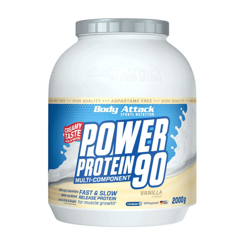 Power Protein 90 Pulver von Body Attack mit Vanilla Geschmack in der 2KG Packung. Power Protein 90 von Body Attack Du bist auf der Suche nach dem perfekten Eiweißpulver und plötzlich tauchen all diese Fragen auf. Wie viel Whey-Protein soll enthalten sein? Muss es Isolat sein oder eher ein Konzentrat? Was ist das überhaupt? Ist Casein wichtig? Mit L-Carnitin oder ohne, zusätzliche Vitamine ja oder nein? Wir helfen dir, die Entscheidung zu treffen: Das Power Protein 90 ist garantiert das richtige Eiweißpulver für dich. Das 5K-Mehrkomponenten-Eiweiß setzt sich aus unterschiedlichen Eiweißquellen zusammen. Dabei sind die verschiedenen Proteine perfekt aufeinander abgestimmt. Den Spagat zwischen schnell verfügbarem Eiweiß und anhaltender Muskelversorgung schafft es mit hochwertigem Whey- und Casein-Protein. Egg-Protein vervollständigt das Aminosäureprofil und sorgt für höchste biologische Wertigkeit. Das macht den „All in One“-Proteinshake zum perfekten Allrounder. Und das nächste Mal bist du darauf trainiert, die richtige Entscheidung zu treffen. Versprochen. Die verschiedenen Proteinquellen garantieren eine ideale Bioverfügbarkeit und ein hervorragendes Aminosäureprofil. Der hohe Anteil an BCAA im Power Protein 90 hat es in sich. Pro Portion liefert der Eiweißshake 9.900 mg BCAA – ideal für deine Muskeln. Power Protein 90 enthält zehn wichtige Vitamine, darunter B-Vitamine, Vitamin C und Vitamin E. Zusammen mit dem hervorragenden Proteinprofil ist dein Körper top versorgt. Unterwegs. Im Training. Im Alltag. Immer Das Power Protein 90 kann noch mehr. Neben wertvollen Vitaminen steckt in jeder Sorte L-Carnitin aus patentiertem Carnipure ™. L-Carnitin ist ein vitaminähnlicher Stoff, der dich beim Shape-Workout unterstützt. Die vielen Features beim Power Protein 90 hören sich aufregend an? Stimmt. Schnapp dir unseren Alleskönner! Der Shootingstar ist aspartamfrei. Außerdem legt Body Attack viel Wert darauf, dass das Produkt in Deutschland hergestellt wird. Für beste Qualität bei Rohstoffen und Verarbeitung. Shake your Power Protein 90! Das Power Protein 90 schmeckt köstlich in Milch oder Wasser. Den cremigen Geschmack bei hervorragender Löslichkeit garantiert es auch, wenn du das Proteinpulver in Wasser mixt. So sparst du dir Kalorien. Trotzdem wird der Shake so cremig, dass du nicht genug bekommst. Wetten? Das Power Protein 90 enthält Wheypep®, das hydrolysierte Molkeneiweiß-Isolat. Aufgrund des schonenden Herstellungsverfahrens bietet Wheypep® ein hervorragendes Aminosäure-Profil, niedrige Laktosewerte und besten Geschmack. Obendrein kann dein Körper Wheypep® schneller aufnehmen und verwerten Shootingstar. Alleskönner. Lieblingsprotein. Das Supereiweiß für jede Sportart. Die Rede ist vom besten Power Protein 90 aller Zeiten. Das Body Attack 5K-Multitalent überzeugt auf ganzer Linie. Perfekt aufeinander abgestimmte Eiweißkomponenten unterstützen dich bei deinen Zielen. Mehr als 85% Eiweiß aus Whey-, Casein- und Egg-Protein, BCAA und L-Carnitin sowie jede Menge Vitamine sind bei diesem Eiweißpulver Standard. Das hört sich aufregend an? Stimmt. Das Power Protein 90 ist der perfekte Begleiter. Für dich. Für jeden. Jederzeit.