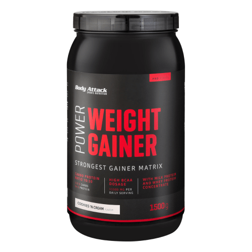 Power Weight-Gainer Pulver von Body Attack mit Cookies & Cream Geschmack in der 1.5KG Packung. Body Attack – Power Weight Gainer Zusatzkalorien für Deinen Masseaufbau – ideal für Hardgainer zur Anreicherung der täglichen Ernährung. Power Weight Gainer von Body Attack – Vorteile: 60g und mehr Kohlenhydrate je Portion (variiert je Geschmack) Milch- und Molkeneiweiß; enthalten umfangreiches Aminosäurenprofil mit Vitaminen und Mineralstoffen angereichert verschiedene Geschmacksvarianten verfügbar Was beinhaltet der Power Weight Gainer von Body Attack? Neben Maltodextrin, als Kohlenhydrat-Hauptbestandteil mit mehr als 70%, liefern Milch- und Molkeneiweiß das enthaltene Protein. Zugefügt wurde eine Vitamin- und Mineralienmischung mit wichtigen B-Vitaminen, Vitamin C, Folsäure + weiteren Vitaminen und den Mineralstoffen Kalzium, Phosphor und Magnesium. Warum Power Weight Gainer von Body Attack? Hardgainer, die Schwierigkeiten haben Masse aufzubauen (Grund kann eine erhöhte Stoffwechselaktivität oder eine genetische Veranlagung sein), können mit dem Power Weight Gainer ihre tägliche Ernährung mit reichlich Kalorien anreichern. So kann er oder sie die Grundlage schaffen, dass ein gezieltes Krafttraining die überschüssigen Kalorien auch zum Muskelaufbau verwendet. Je Portion liefert ein Shake, gemischt mit fettarmer Milch, z.B. im Geschmack Vanille 421kcal. Der Shake sollte als Anreicherung zur normalen Ernährung verwendet werden. Wie wird der Power Weight Gainer verwendet?Für 1 Portion mische 50g Power Weight Gainer Pulver mit 0,5l fettarmer Milch (für zusätzliche Kalorien kannst Du auch Vollmilch verwenden) oder einer pflanzlichen Alternative.1-2 x täglich 1 Portion als Zwischenmahlzeit oder direkt vor dem Schlafengehen nutzen. Power Weight-Gainer – 1500g – Cookies & Cream hat die PZN 09392958. Zusatzkalorien für Deinen Masseaufbau – ideal für Hardgainer zur Anreicherung der täglichen Ernährung.