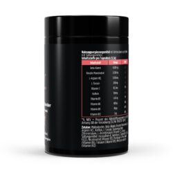 Maltodextrin, Beta-Alanin, Kreatin Monohydrat, L-Arginin HCL, Koffein, L-Tyrosin, Zitronensäure, L-Ascorbinsäure (Vitamin C), Aroma, Süßungsmittel: (Acesulfam-K, Sucralose), Riboflavin (Vitamin B2), Nicotinamid (Vitamin B3), Pyridoxal-5-Phosphat (Vitamin B6), Folsäure (Vitamin B9), Methylcobalamin (Vitamin B12)