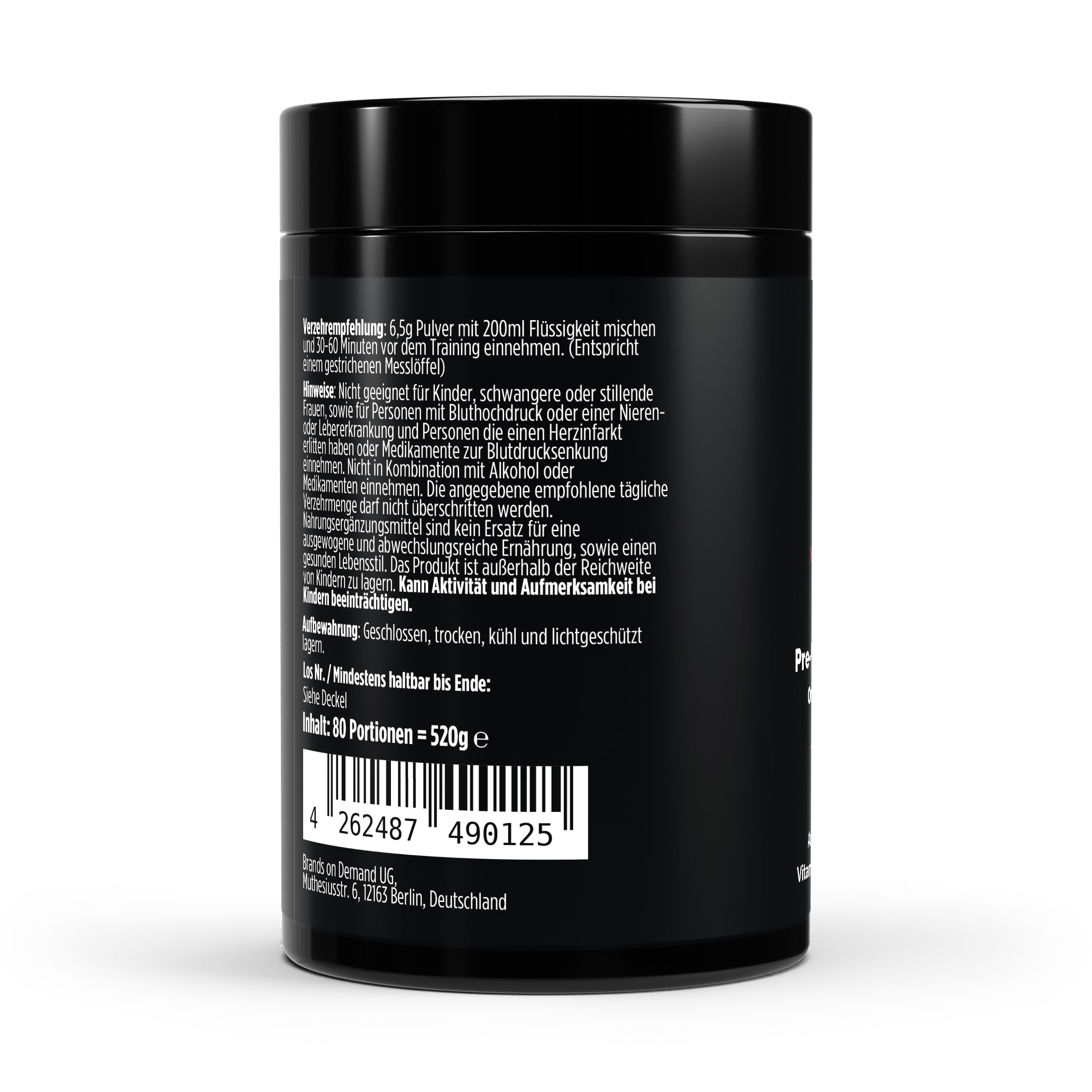 Maltodextrin, Beta-Alanin, Kreatin Monohydrat, L-Arginin HCL, Koffein, L-Tyrosin, Zitronensäure, L-Ascorbinsäure (Vitamin C), Aroma, Süßungsmittel: (Acesulfam-K, Sucralose), Riboflavin (Vitamin B2), Nicotinamid (Vitamin B3), Pyridoxal-5-Phosphat (Vitamin B6), Folsäure (Vitamin B9), Methylcobalamin (Vitamin B12)