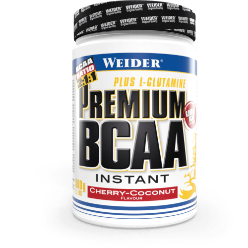 Premium BCAA Powder Pulver von Weider mit Cherry-Coconut Geschmack in der 0.5KG Packung. Weider – Premium BCAA Pulver BCAA Pulver in fruchtigen Geschmacksrichtungen zur Versorgung mit wichtigen Eiweißbausteinen rund ums Training. Premium BCAA von Weider – Vorteile: synthetisch hergestellte Aminosäuren qualitativ hochwertig insgesamt 7500mg BCAA und Glutamin je Portion enthalten verschiedene Geschmacksrichtungen verfügbar Was beinhaltet Premium BCAA Pulver? Das Premium BCAA Pulver von Weider enthält BCAA-Aminosäuren (L-Isoleucin, L-Leucin, L-Valin) und L-Glutamin, je Portion (10g Pulver) 7500mg. Zudem ist im Pulver Maltodextrin enthalten und gesüßt wird mit Süßstoff. Warum BCAA? Die drei BCAA Aminosäuren L-Leucin, L-Isoleucin und L-Valin können vom Körper nicht selbst hergestellt werden und müssen daher über die Nahrung oder Nahrungsergänzungsmittel aufgenommen werden. Sie sind an zahlreichen Stoffwechselprozessen, insbesondere am Eiweißstoffwechsel, beteiligt und für den Körper lebensnotwendig. Besonders Sportler in intensiven Trainingsphasen zum Muskelaufbau sollten auf eine ausreichende Versorgung rund ums Training achten, damit dem Körper zur Energiegewinnung und für die Regeneration ausreichend BCAA zur Verfügung stehen. Warum L-Glutamin? L-Glutamin gehört zu den körpereigenen Aminosäuren und trägt im Körper zur Verringerung von Müdigkeit bei, unterstützt die Synthese anderer Aminosäuren, ist an der Blutbildung und Zellteilung beteiligt und spielt bei zahlreichen weiteren Körperfunktionen eine wichtige Rolle. Besonders für die Verringerung von Müdigkeit und für die Aminosäurensynthese benötigen gerade hart trainierende Sportler eine ausreichende Versorgung mit Glutamin, da hier die Eigensynthese den Bedarf nicht immer decken kann. Warum Premium BCAA von Weider? Das Pulver bietet eine schnelle und einfache Möglichkeit den Anteil von BCAA und L-Glutamin im Körper zu erhöhen. Idealer Zeitpunkt für die Nutzung ist rund ums Training. Wie wird Premium BCAA verwendet? Sportler in intensiven Trainingsphasen nutzen BCAA Supplements rund ums Training. Dazu 10g Pulver mit 200ml Wasser in einem Shaker mischen und vor dem Training trinken. Diese essentiellen Aminosäuren können vom Körper nicht selbst hergestellt werden und müssen über Nahrungsergänzungsmittel oder eine proteinreiche Ernährung zugeführt werden.