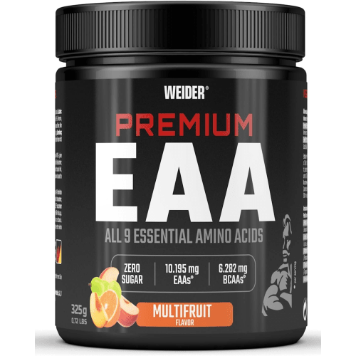 Premium EAA Powder Pulver von Weider mit Multifrucht Geschmack in der 0.325KG Packung. Premium EAA Powder von Weider Essentielle Aminosäuren sind Eiweißbausteine, die der menschliche Körper nicht eigenständig herstellen kann. Deshalb ist eine ausreichende Zufuhr, insbesondere für Sportler und körperlich aktive Menschen, über die Nahrung unabdingbar. Jede Portion des leckeren Premium EAA versorgt den Körper mit über 10 g EAAs und eignet sich ideal als kalorienarme Intra-Workout Versorgung für die Muskeln. Premium EAA – Essentielle Aminosäuren für dein Training Essentielle Aminosäuren (EAAs) sind lebenswichtige Bausteine von Proteinen, die der Körper nicht selbst herstellen kann. Daher ist eine ausreichende Zufuhr über die Ernährung besonders wichtig – vor allem für Sportler und aktive Menschen. Jede Portion des Premium EAA liefert mehr als 10 g EAAs, darunter die drei verzweigtkettigen Aminosäuren L-Leucin, L-Isoleucin und L-Valin (BCAA) im optimalen 2:1:1-Verhältnis. Das vegane Pulver ist zudem kohlenhydratfrei und kalorienarm, wodurch es sich perfekt als Intra-Workout-Support für deine Muskeln eignet. Erlebe selbst, was das Produkt in sich hat!