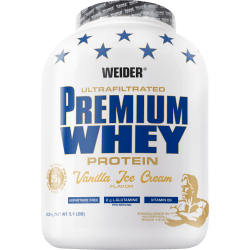 Premium Whey Protein Pulver von Weider mit Vanilla Ice Cream Geschmack in der 2.3KG Packung. Was ist das WEIDER Premium Whey Protein und wie wirkt es? Weider ist es gelungen, ein biologisch hochwertiges Molkeneiweiß zu entwickeln, welches sehr gut im Geschmack ist und die ernährungsphysiologischen Bedürfnisse deckt. Bei der Herstellung wird nur das mikrofiltrierte Eiweiß verwendet, welches keiner hohen Hitze und keinem Druck ausgesetzt wird. Die Zusammensetzung des Produkts liefert einen hohen Gehalt an BCAAs und proteinogenen Aminosäuren. Das Produkt enthält Globulin und Glycomacropeptide, welche als bioaktive Substanzen bezeichnet werden. Zudem sind Beta- und Alpha-Lactoglobuline enthalten. Proteine tragen zur Erhaltung von Muskelmasse bei. Das Weider Premium Whey ist sowohl für Soft- und Hardgainer geeignet. Das Premium Whey wird vom Körper gut aufgenommen. Es eignet sich daher besonders gut zum Frühstück und nach dem Training. Hochwertiges Proteinkonzentrat für den Muskelaufbau.