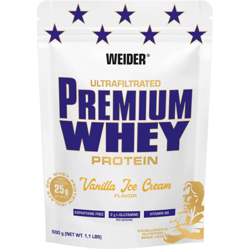 Premium Whey Protein Pulver von Weider mit Vanilla Ice Cream Geschmack in der 0.5KG Packung. Was ist das WEIDER Premium Whey Protein und wie wirkt es? Weider ist es gelungen, ein biologisch hochwertiges Molkeneiweiß zu entwickeln, welches sehr gut im Geschmack ist und die ernährungsphysiologischen Bedürfnisse deckt. Bei der Herstellung wird nur das mikrofiltrierte Eiweiß verwendet, welches keiner hohen Hitze und keinem Druck ausgesetzt wird. Die Zusammensetzung des Produkts liefert einen hohen Gehalt an BCAAs und proteinogenen Aminosäuren. Das Produkt enthält Globulin und Glycomacropeptide, welche als bioaktive Substanzen bezeichnet werden. Zudem sind Beta- und Alpha-Lactoglobuline enthalten. Proteine tragen zur Erhaltung von Muskelmasse bei. Das Weider Premium Whey ist sowohl für Soft- und Hardgainer geeignet. Das Premium Whey wird vom Körper gut aufgenommen. Es eignet sich daher besonders gut zum Frühstück und nach dem Training. Hochwertiges Proteinkonzentrat für den Muskelaufbau.