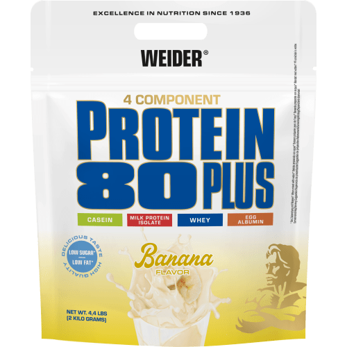 Protein 80 Plus Pulver von Weider mit Banane Geschmack in der 2KG Packung. Was ist Protein 80 Plus von Weider und wie wirkt es? Protein 80 Plus ist ein 4-Komponenten-Eiweiß, das die jeweiligen Vorzüge eines jeden Proteins in einem Produkt vereint und Dir eine optimale Eiweißversorgung garantiert! Die verschiedenen Bestandteile zeichnen sich durch ihre hohe biologische Wertigkeit aus. Kurzkettige Whey-Proteine und langkettige Ei-Eiweiße, Casein und Milcheiweiße tragen zu Muskelaufbau und Muskelerhalt bei. Weiterhin zeichnet sich der Allrounder durch seine gute Löslichkeit und seine extra cremige Konsistenz aus, die in mehreren leckeren Geschmacksrichtungen erhältlich ist. Das Produkt eignet sich hervorragend für Bodybuilder, Ausdauersportler, Fitnesssportler, Kraftsportler und Abnehmwillige – ein Allrounder in allen Lebenslagen. Eine Portion enthält 30g Pulver (ca. 2 gehäufte Eßlöffel). Das Pulver wird mit etwa 300ml fettarmer Milch verrührt, dann erhält es seine besonders cremige Konsistenz. Je nach Eiweissbedarf werden 1-2 Portionen täglich getrunken. Auch an trainingsfreien Tagen sollte ein Shake als Zwischensnack oder vor dem Schlafengehen verzehrt werden. Um die Nieren nicht zu belasten, sollte außerdem ausreichend Wasser zusätzlich getrunken werden. Der Eiweiß-Allrounder lässt dich nie im Stich!