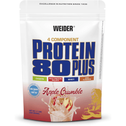 Protein 80 Plus Pulver von Weider mit Apple Crumble Geschmack in der 0.5KG Packung. Was ist Protein 80 Plus von Weider und wie wirkt es? Protein 80 Plus ist ein 4-Komponenten-Eiweiß, das die jeweiligen Vorzüge eines jeden Proteins in einem Produkt vereint und Dir eine optimale Eiweißversorgung garantiert! Die verschiedenen Bestandteile zeichnen sich durch ihre hohe biologische Wertigkeit aus. Kurzkettige Whey-Proteine und langkettige Ei-Eiweiße, Casein und Milcheiweiße tragen zu Muskelaufbau und Muskelerhalt bei. Weiterhin zeichnet sich der Allrounder durch seine gute Löslichkeit und seine extra cremige Konsistenz aus, die in mehreren leckeren Geschmacksrichtungen erhältlich ist. Das Produkt eignet sich hervorragend für Bodybuilder, Ausdauersportler, Fitnesssportler, Kraftsportler und Abnehmwillige – ein Allrounder in allen Lebenslagen. Eine Portion enthält 30g Pulver (ca. 2 gehäufte Eßlöffel). Das Pulver wird mit etwa 300ml fettarmer Milch verrührt, dann erhält es seine besonders cremige Konsistenz. Je nach Eiweissbedarf werden 1-2 Portionen täglich getrunken. Auch an trainingsfreien Tagen sollte ein Shake als Zwischensnack oder vor dem Schlafengehen verzehrt werden. Um die Nieren nicht zu belasten, sollte außerdem ausreichend Wasser zusätzlich getrunken werden. Protein 80Plus – Hochwertiger Eiweiß-Allrounder für maximale Effektivität Protein 80Plus ist eine speziell entwickelte Eiweißmischung, die vier hochwertige Proteinquellen vereint: Casein, Milcheiweißisolat, Molkeneiweiß und Hühnereiweiß. Durch diese Kombination bietet es eine optimale biologische Wertigkeit und ein ausgewogenes Aminosäureprofil, das den Körper über einen längeren Zeitraum mit wichtigen Proteinen versorgt. Dank verschiedenen Eiweißkomponenten eignet sich Protein 80Plus sowohl für den Muskelaufbau als auch für die Regeneration nach dem Training. Das enthaltene Casein sorgt für eine langanhaltende Eiweißversorgung, während das Molkeneiweiß besonders schnell aufgenommen wird – ideal für Sportler und aktive Menschen. Zusätzlich überzeugt Protein 80Plus mit einem hervorragenden Geschmack, einer besonders cremigen Konsistenz und einem geringen Fett- und Kohlenhydratgehalt. Ob als Shake nach dem Training oder als proteinreiche Ergänzung im Alltag – dieses Mehrkomponentenpro…