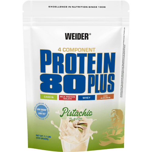 Protein 80 Plus Pulver von Weider mit Pistazie Geschmack in der 0.5KG Packung. Weider – Protein 80 Plus Weider Protein 80 Plus ist ein hochwertiges Mehr-Komponenten Protein und wird in zahlreichen leckeren Geschmacksrichtungen angeboten. Die Einnahme wird besonders in der Definitionsphase, Muskelaufbauphase und Kraftaufbauphase empfohlen. Vorteile von Weider – Protein 80 Plus: low fat und low sugar hoher Anteil an BCAAs Milchprotein (Caseinat) Milchproteinisolat Molkenprotein (Whey) Eiprotein (Albumin) Was enthält Protein 80 Plus? Das Protein 80 Plus von Weider ist ein Mehr-Komponenten Protein, genauer ein aus 4 Eiweißquellen bestehendes Supplement. Diese 4 Eiweißquellen sind Calciumcaseinat, Milchproteinisolat, Molkenproteinkonzentrat und Eiklarpulver. Der Eiweißanteil beträgt etwa 83%, bei einem Kohlenhydratanteil von ca. 6% und einem sehr geringen Fettanteil von 1,8%. Auch das Aminosäurenprofil besticht durch hohe Werte und zusätzlich gibt es einen hohen Anteil an L-Glutamin Säure und L-Arginin. Weider Protein 80 Plus versorgt die trainierte Muskulatur mit hochwertigem Protein. In Verbindung mit einer ausgewogenen Ernährung, einer vitalen Lebensweise und einem ambitionierten und nachhaltigen Trainingsprogramm, ist dieses Supplement für viele Sportler auf der ganzen Welt ein fester Bestandteil ihres täglichen Workouts geworden. Das zugesetzte Vitamin B6 dient als stimulierender Co-Faktor und kann zur Verringerung der Müdigkeit beitragen. Das enthaltene Calcium unterstützt eine normale Blutgerinnung. Die geschmackliche Nummer 1 Das Weider Protein 80 Plus ist unter Sportlern und Bodybuildern aufgrund seines hervorragenden Geschmacks bekannt. Vor allem die Mischung mit Milch ergibt einen schmackhaften und cremigen Shake. In unserem Shop bieten wir viele der verfügbaren, leckeren Geschmacksrichtung des Protein 80 Plus von Weider an. Allergene: Enthält Milch, Ei. Kann Spuren von Gluten und Soja enthalten. Verzehrempfehlung: 1 Portion = 30 g Pulver (ca. 2 gehäufte Esslöffel) mit 300 ml fettarmer Milch (1,5% Fett) shaken. Mindestens einen Shake täglich. Vorzugsweise nach dem Training. Der Eiweiß-Allrounder lässt dich nie im Stich!