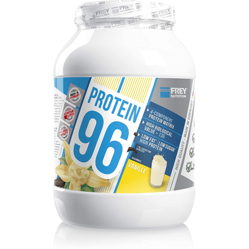 Protein 96 Pulver von FREY Nutrition mit Vanille Geschmack in der 2.3KG Packung. FREY Nutrition – Protein 96 Das Protein 96 ist wahrlich ein einzigartiges Eiweiß-Produkt! Es erreicht durch die verschiedenen Proteinkomponenten wie Milchprotein, Molkenprotein-Isolat, Molkenprotein-Konzentrat und Eiprotein eine unglaublich hohe biologische Wertigkeit von über 136! Der Proteingehalt liegt bei durchschnittlich 96 % i. Tr. Protein 96 schmeckt sowohl mit Milch als auch mit Wasser – da es auf Wasserbasis entwickelt wurde – und lässt sich leicht (ohne Mixer) zubereiten. Vorteile sehr hoher Proteinanteil von bis zu 100 % Protein i. Tr. sehr hohe biologische Wertigkeit von über 136 kann sowohl mit Milch als auch mit Wasser verzehrt werden sehr gute Löslichkeit, kein Verklumpen leckerer und cremiger Geschmack Protein 96 – 2300g – Vanille hat die PZN 10534197. Protein 96 – 2,3 kg von FREY Nutrition besitzt einen sehr hoher Proteinanteil von bis zu 100 % Protein i. Tr.