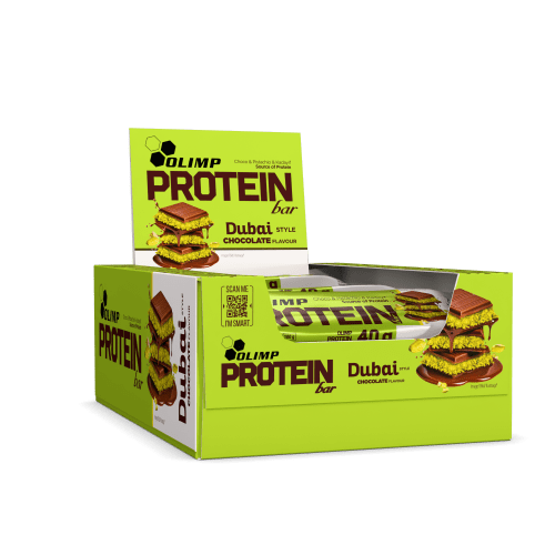 Protein Bar Dubai Style Riegel von Olimp mit Dubai Style Chocolate Geschmack in der 1KG Packung. Echter Pistaziengenuss, proteinreich und natürlich – dein smarter Snack für jeden Tag. Olimp Protein Bar – Dubai Style Chocolate kombiniert Pistazienpaste, Milchschokolade und knusprigen Kataifi-Teig zu einem ausgewogenen Proteinriegel. Mit 39 % echter Pistazienpaste aus 100 % Pistazien bietet er ein natürlich-intensives Aroma. Der Riegel kommt ohne künstliche Aromen, Farbstoffe, Füllstoffe, gehärtete Fette und Polyole aus und ist damit eine ideale Wahl für bewusste Ernährung – sowohl rund ums Training als auch als praktischer Snack im Alltag.
