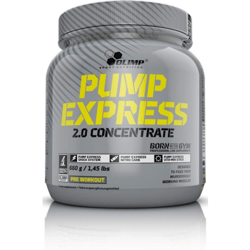 Pump Express 2.0 concentrate Pulver von Olimp mit Orange Geschmack in der 0.66KG Packung. Olimp – Pump Express 2.0 660 gPump Express 2.0 – ein Pre-Workout für den Energieschub beim Training! Pump Express 2.0 von Olimp ist eine Zusammenstellung aus 3 verschiedenen Formeln:- Pump Express Nitro Carb (eine Verbindung aus reinen Aminosäuren und Kohlenhydraten),- Pump Express Shock System (mikronisiertes Kreatin und pharmazeutisches Koffein),- Vita-MIN Stack (ein Komplex von wichtigen Vitaminen und Mineralstoffen).Alle Formeln unterstützen den Körper bei anspruchsvollem und hartem Training. Vorteile von Pump-Express 2.0: Weiterentwicklung von Pump Express enthält Kreatin Koffein und grüner Tee-Extrakt beigefügt L-Arginin und BCAA’s Mit Aminosäuren, Kohlenhydraten, Kreatin, Koffein und Vitaminen.