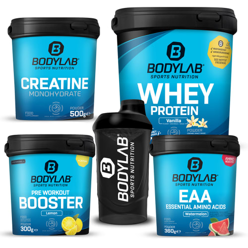 Pumper Plus Stack Pulver von Bodylab24. Die Kombination aus dem Bodylab Whey Protein in der 1kg Box, Creatine Powder, EAA Essential Amino Acids und dem Pre Workout Booster + Shaker. Die klassische Supplement-Versorgung rund ums Training. Mit Creatine – der Erfolgsformel für Energie, Kraft und Muskelaufbau, Whey Protein und EAA Essential Amino Acids zur Unterstützung beim Muskelaufbau und dem Pre Workout Booster zum Start ins Training. Ideal für alle Athleten – egal ob Profi oder Anfänger!