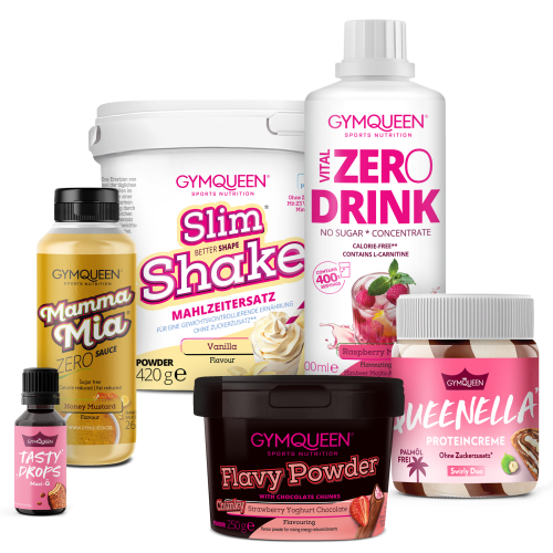Queen Bestseller GYMQUEEN. 1Wenn du dein Gewicht reduzieren möchtest, solltest du zwei Hauptmahlzeiten pro Tag durch einen Slim Shake ersetzen. Ist es dein Ziel, dein Gewicht zu halten, genügt es, eine Hauptmahlzeit durch einen Abnehm-Shake pro Tag zu ersetzen. Dazu solltest du die Zubereitungsempfehlung einhalten. Achte auf eine ausreichende Flüssigkeitsaufnahme, am besten in Form von Wasser. Der Shake erfüllt nur im Rahmen einer kalorienreduzierten Ernährung den angestrebten Zweck, deshalb solltest du darauf achten, dass andere Lebensmittel Teil der Ernährung sind. Bei Langzeitverwendung und Allergien wird empfohlen ärztlichen Rat einzuholen. 2Enthält von Natur aus Zucker. 3Wenn du, anstatt auf herkömmliche Desserts zurückzugreifen, deine Desserts mit den kalorienreduzierte Flavy Powders selbst zubereitest, kannst du dabei Zucker und Kalorien sparen. 3Ausnahme Kokos Schokolade: Proteingehalt 4,9 g, Kokos Mandel: 7,7 g Protein. Ein konkretes Beispiel – Nährwerte im Vergleich: Herkömmlicher Stracciatella Joghurt (253 g) vs. Naturjoghurt 3,8 % Fett (250 g) mit 3 g Flavy Powder „Chunky Stracciatella“ Nährwerte Naturjoghurt mit Flavy Powder Herkömmlicher Stracciatella Joghurt Kalorien 186 kcal 278 kcal Fett 9,7 g 11 g davon gesättigte Fettsäuren 6,4 g 7,1 g Kohlenhydrate 13 g 38 g davon Zucker 13 g 35 g Ballaststoffe 1,7 g 0 g Eiweiß 11 g 7,8 g Salz 0,25 g 0,25 g Weitere Beispiele: Statt herkömmlichen Zucker im Kaffee oder in Gebäck kannst du auf deine Lieblingssorte Flavy Powder zurückgreifen. Der Zuckergehalt der Flavy Powder kann je Sorte variieren. Du möchtest die große Vielfalt des GYMQUEEN Sortimentes auf einmal probieren? Dann gönn‘ dir das Queen Bestseller Paket! Hier erhältst du die beliebtesten Produkte unserer Community zum unschlagbaren Vorteilspreis. Von Slim1 Shake und Zero Drink über Flavy Powder, Mamma Mia Zero Saucen und Tasty Drops bis hin zur Queenella – hier ist alles dabei, was das GYMQUEEN Herz höher schlagen lässt. BITTE BEACHTE : Aufgrund unseres Design Umstellungsprozesses kann es sein, dass du den Slim Shake noch im alten Design erhältst.