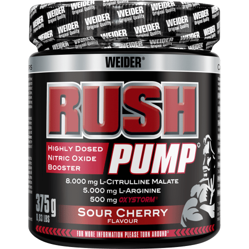 Rush Pump Sauerkirsche Pulver von Weider mit Sauerkirsche Geschmack in der 0.375KG Packung. Rush Pump von Weider Ein hochdosierter Pre-Workout Booster ohne Koffein, Kreatin oder jegliche Stimulanzien – optimal für jeder der auf sowas verzichten möchte. Hochdosiert mit L-Citrullin und L-Arginin, hat der Booster es wirklich in sich. Die enthaltenen Vitaminen und Mineralstoffen runden das ganze ab. Worauf wartest du noch? Gönn dir den ultimativen Pump! Rush Pump – Dein Pre-Workout ohne Stimulantien Rush Pump ist die ideale Wahl für ambitionierte Sportler, die auf Koffein und andere Stimulanzien verzichten möchten. Die leistungsstarke Rezeptur enthält beeindruckende 8.000 mg L-Citrullin Malat sowie 5.000 mg L-Arginin – zwei essenzielle Vorstufen der körpereigenen Stickstoffmonoxid (N.O.)-Synthese. Zusätzlich liefert der enthaltene Körneramaranthextrakt „OXYSTORM®“ wertvolle natürliche Nitrate. Die sorgfältig abgestimmte Formel wird durch essenzielle Vitamine und Mineralstoffe ergänzt, die den Energiestoffwechsel sowie die normale Muskelfunktion unterstützen.