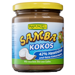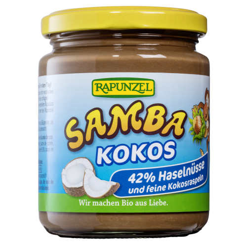Samba Kokos bio Rapunzel. Ein guter Tag beginnt mit einem guten Frühstück! Eco control number: DE-ÖKO-006 Schwungvoll in den Tag zu starten, ist nicht nur für alle Sportler ein Muss. Auch vor dem Weg ins Büro oder in die Schule versüßt Dir Samba Kokos von Rapunzel schon den Tag. So liefert der geschmackvolle Brotaufstrich neben der Extraportion Haselnüssen auch edlen Kakao, Allgäuer Vollmilch, echte Bourbon Vanille und exotische Kokosraspeln vereint als cremigen Genuss. So kann Dein Tag gar nicht schlecht beginnen! Samba Kokos von Rapunzel ist auch Vegetariern zu empfehlen. Es lässt sich als leckerer Brotaufstrich genießen, kann aber auch Crepes oder Pfannkuchen geschmackvoll verfeinern oder zum Backen verwendet werden.