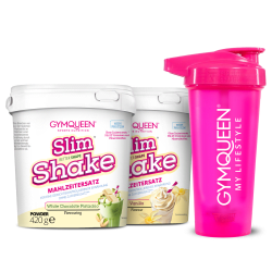 Slim Shake 2er Pack + Perfect Shaker Pulver von GYMQUEEN. 1 Wenn du dein Gewicht reduzieren möchtest, solltest du zwei Hauptmahlzeiten pro Tag durch einen Slim Shake ersetzen. Ist es dein Ziel, dein Gewicht zu halten, genügt es, eine Hauptmahlzeit durch einen Abnehm-Shake pro Tag zu ersetzen. Dazu solltest du die Zubereitungsempfehlung einhalten. Achte auf eine ausreichende Flüssigkeitsaufnahme, am besten in Form von Wasser. Der Shake erfüllt nur im Rahmen einer kalorienreduzierten Ernährung den angestrebten Zweck, deshalb solltest du darauf achten, dass andere Lebensmittel Teil der Ernährung sind. Bei Langzeitverwendung und Allergien wird empfohlen ärztlichen Rat einzuholen. 2 Enthält von Natur aus Zucker. Schluss mit klumpigen Shakes! Der Perfect Shaker sorgt für perfekt gemixte, cremige Shakes – egal ob beim Training, unterwegs oder im Büro. Einfach schütteln und genießen! Dazu bekommst du gleich 2x unseren Slim¹ Shake, der nicht nur super lecker und cremig ist, sondern dich auch mit hochwertigem Eiweiß, Vitaminen und Mineralstoffen versorgt.