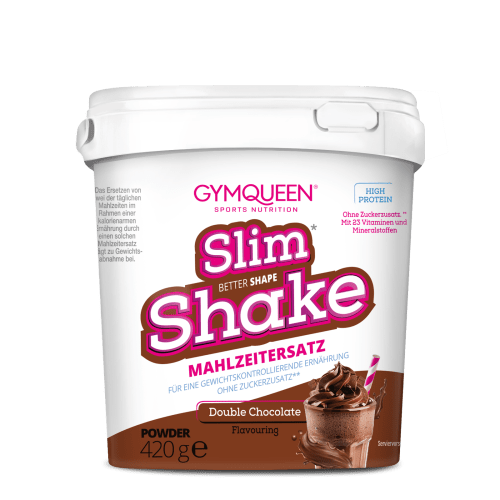 Slim Shake Mahlzeitersatz-Shake Pulver von GYMQUEEN mit Double Chocolate Geschmack in der 0.42KG Packung. Verzicht war gestern, ab jetzt heißt es kalorienarm schlemmen und genießen! Mit unserem angenehm süßen Slim¹ Shakes kannst du eine komplette Mahlzeit ersetzen und dabei ganz schön Kalorien sparen.¹ Mit nur 250 kcal pro Portion versorgt dich der Slim¹ Shake mit unglaublichen 21 g Protein und einer Mischung aus wertvollen Vitaminen und Mineralstoffen wie Vitamin D, Vitamin B12, Folsäure, Eisen und Calcium. Für die unfassbar cremige Konsistenz sorgt Glucomannan, ein Ballaststoff aus der Konjakwurzel, der viele positive Eigenschaften mit sich bringt. Unser Slim¹ Shake kann übrigens mehr als nur beim Abnehmen helfen.¹ Da die Zubereitung gerade mal 30 Sekunden dauert, eignet sie sich auch perfekt als Mahlzeitenersatz und versorgt dich somit auch an stressigen Tagen mit den nötigen Nährstoffen und Vitaminen. ¹Wenn du dein Gewicht reduzieren möchtest, solltest du zwei Hauptmahlzeiten pro Tag durch einen Slim Shake ersetzen. Ist es dein Ziel, dein Gewicht zu halten, genügt es, eine Hauptmahlzeit durch einen Abnehm-Shake pro Tag zu ersetzen. Dazu solltest du die Zubereitungsempfehlung einhalten. Achte auf eine ausreichende Flüssigkeitsaufnahme, am besten in Form von Wasser. Der Shake erfüllt nur im Rahmen einer kalorienreduzierten Ernährung den angestrebten Zweck, deshalb solltest du darauf achten, dass andere Lebensmittel Teil der Ernährung sind. Bei Langzeitverwendung und Allergien wird empfohlen ärztlichen Rat einzuholen. Nährwerte für eine Portion Slim¹ Shake Vanilla mit Milch (1,5 % Fett): Durchschnittliche Nährwerte pro Portion (30 g Pulver + 275 ml Milch (1,5 % Fett)) Energie 1031 kJ / 246 kcal Fett 7,5 g davon gesättigte Fettsäuren 3,9 g Kohlenhydrate 23 g davon Zucker 17 g Ballaststoffe 1,2 g Eiweiß 21 g Salz 0,66 g Vitamine und Mineralstoffe pro Portion (30 g Pulver + 275 ml Milch (1,5 % Fett)) % Nährstoffreferenzwerte Vitamin A 284 µg 35 % Vitamin D 2 µg 34 % Vitamin E 4 mg 34 % Vitamin K 25 µg 34 % Vitamin C 28 mg 35 % Thiamin 0,4 mg 37 % Riboflavin 1 mg 46 % Niacin 5 mg 34 % Vitamin B6 1 mg 36 % Folsäure 74 µg 37 % Vitamin B12 1,3 µg 52 % Biotin 17 µg 34 % Pantothensäure 2 mg 34 % Kalium 916 mg 46 % Calcium 273 mg 34 % Phosphor 740 mg 106 % Magnesium 162 mg 43 % Eisen 19 mg 134 % Zink 3 mg 34 % Kupfer 0,3 mg 35 % Mangan 1 mg 34 % Selen 19 µg 35 % Jod 50 µg 34 % So lecker und vielfältig war Abnehmen¹ noch nie! Unser Slim¹ Shake besitzt einen hohen Proteingehalt und versorgt dich mit wichtigen Vitaminen und Mineralien sowie einer einzigartig cremigen Textur. Und das bei gerade mal 250 kcal pro Portion! Eine Portion des Slim¹ Shakes ersetzt eine vollwertige Mahlzeit und trägt so zur Gewichtsabnahme bei.¹