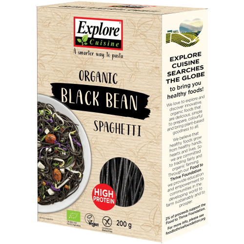 Spaghetti schwarze Bohnen bio Explore Cuisine. Schwarze Spaghetti Bohnen bio von Pocket Cuisine Explore Cuisine Spaghetti bestehen nicht aus Weizen, sondern aus Sojabohnen, sind von Natur aus glutenfrei und zeichnen sich durch einen hohen Gehalt an pflanzlichen Proteinen und Ballaststoffen aus. Zudem sind sie low carb, fett- und kalorienarm und passen damit ideal zu einer gesunden Ernährungsweise. Sie sind al dente im Biss und werden wie herkömmliche Pasta zubereitet. Mit ihrer exotischen, dunklen Farbe und ihrem kräftigen Geschmack bereichern sie jeden Speiseplan. Eco control number: CN-BIO-141 Schwarze Spaghetti als Hingucker auf dem Teller.