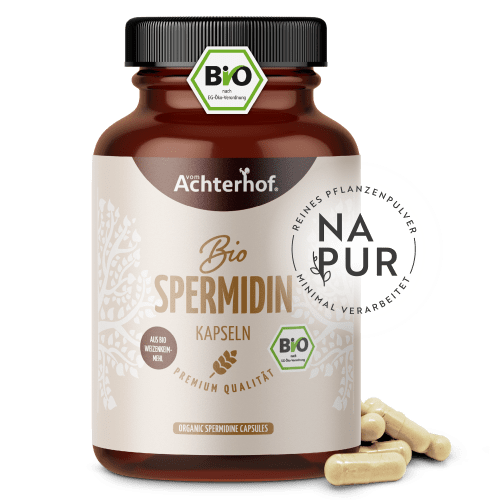 Spermidin Kapseln Bio Kapseln von vom Achterhof. Das ist Spermidin Spermidin ist ein biogenes Polyamin, welches in jüngsten Studien der Ernährungskunde immer häufiger Beachtung findet. Spermidin kann vom Körper selbst gebildet werden und kommt in jeder Körperzelle vor. Der Name kommt daher, dass der Inhaltsstoff erstmals in der männlichen Samenflüssigkeit entdeckt wurde, jedoch wird es auch von Darmbakterien synthetisiert. Andererseits kann Spermidin auch über die Nahrung aufgenommen werden. Besonders reich an Spermidin sind reife Käsesorten, Pilze, Sojabohnen, Hülsenfrüchte und Weizenkeime, wobei Weizenkeime dafür bekannt sind den höchsten Anteil an pflanzlichen Spermidin zu enthalten. Der Spermidingehalt in unseren Zellen nimmt im Laufe der Zeit automatisch ab. Daher empfehlen wir eine Supplementierung mit zunehmendem Alter. Ein besonders schonender Herstellungsprozess Weizenkeime befinden sich an der Spitze von reifen Weizenkörnern und werden bei der Weizenherstellung oftmals als Abfallprodukt gesehen. Die kleinen Keimlinge stecken jedoch voller wichtiger Nährstoffe, enthalten Spermidin und sind damit der wertvollste Teil des Weizenkorns. Für unsere Spermidin Kapseln verwenden wir ausschließlich hochwertiges Weizenkeim Pulver in Bio-Qualität. In einem schonenden Verfahren werden die Weizenkeimlinge vorsichtig teilentölt und anschließend fein vermahlen, wodurch die Nährstoffe enthalten bleiben. Unsere Spermidin Kapseln sind mit 2800 mg Weizenkeimmehl pro Tagesportion (4 Kapseln) besonders hoch dosiert, darin enthalten sind 1 mg natürliches Spermidin. Qualität ist unsere höchste Prämisse Bei unserem Spermidin Kapseln enthältst du ein Qualitätsprodukt höchster Güte. Bei unseren Kapseln handelt es sich selbstverständlich um vegane und naturreine Kapseln ohne Zusatzstoffe. Die Kapselhülle ist frei von Magnesiumstearat, Trennmitteln, Aromen, Farbstoffen, Stabilisatoren, Konservierungsstoffen und Gelatine. Eco control number: DE-ÖKO-001 Für unsere Spermidin Kapseln verwenden wir ausschließlich hochwertiges Weizenkeim Pulver in Bio-Qualität. Zur Gewinnung des Weizenkeimpulvers, werden die Weizenkeimlinge in einem schonenden Verfahren teilentölt, wodurch sie die Nährstoffe enthalten bleiben. Die Kapselhülle besteht aus veganen Pflanzenfasern, denn Qualität ist unser höchster Anspruch. Unsere Spermidin Kapseln sind mit 2800 mg Weizenkeimmehl pro Tagesportion (4 Kapseln) dosiert, darin enthalten sind 1 mg natürliches Spermidin.
