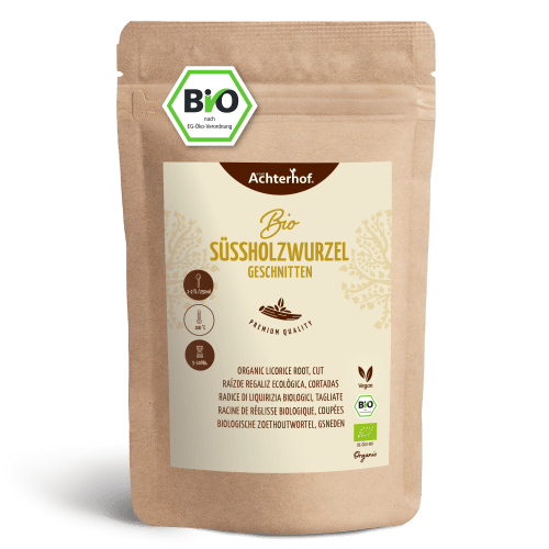 Süßholzwurzel geschnitten Bio vom Achterhof. Geschnittene BIO Süßholzwurzel: Für einen natürlich, süßen Tee Die traditionsreiche Wurzel stilvoll genießen Gesunde Ernährung, hochwertige Bio Produkte direkt aus der Natur: Immer mehr Menschen legen Wert darauf, welche Lebensmittel sie konsumieren. Ein heißer Tee aus natürlichen Inhaltsstoffen steht als Getränk ganz oben auf der Einkaufsliste ernährungsbewusster Menschen. Als kalorienfreier Durstlöscher findet der süßliche Tee viele Freunde – und wird für unseren Shop in Bio-Qualität nachhaltig produziert. Unser Wurzel-Tee bereichert mit seinem markanten, süßlichen Geschmack das morgendliche Frühstück und macht die kleine Pause am Nachmittag zur entspannten Mini-Auszeit vom Alltag. Deinen Süßholzwurzel Tee Bio kannst du ganz bequem online einkaufen. Bestelle einfach in unserem Shop, und lass dir die kalorienarme Köstlichkeit aus der Natur direkt nach Hause schicken. Das Bio-Produkt aus der Natur kommt ohne jeden Zusatz aus: Ausschließlich die getrockneten Wurzeln des Süßholzes entfalten in diesem Bio Tee Geschmack und Wirkung. Der ökologische Anbau schont Umwelt und Natur und passt damit perfekt in die nachhaltige, moderne Ernährung. Das hochwertige Endprodukt ist nicht nur natürlich und lecker: Süßholzwurzel Tee Bio ist vegan, lactose- und sojafrei und natürlich ohne jeden Zuckerzusatz. Bestelle deinen neuen Lieblingstee jetzt online, und genieße den Geschmack reinster Tees aus unseren Bio-Anbaugebieten. Die Süßholzwurzel, ein robustes Kraut mit Tradition Schon die Ägypter der Antike kannten eine Köstlichkeit, die aus der Süßholzwurzel hergestellt wird: Feinstes Lakritz, salzig oder süß, ist bis heute eine beliebte Leckerei bei großen und kleinen Genießern. Die Pflanze selbst trägt den Namen Echtes Süßholz, lateinisch Glycyrrhiza glabra Süßholzwurzel Herkunft Rund ums Mittelmeer und im westlichen Asien hat die bis eineinhalb Meter hohe Pflanze ihre Heimat. Zartlilafarbene Blüten ziehen bunte Schmetterlinge an, wenn das Süßholz im späten Sommer blüht. Vom vorderen Orient aus fand die buschige Pflanze ihren Weg auch nach Mitteleuropa, Seefahrer brachten die süßen Wurzeln einst auch nach Europa, was vielleicht ein Grund dafür ist, dass sich an den Küstenregionen das Lakritz schnell seine Fans eroberte und bis heute behielt. In Süddeutschland wurde sie im 19. Jahrhundert großflächig angebaut. Verarbeitet wurde in erster Linie die Wurzel, aus der ein Extrakt gewonnen und auf verschiedene Weise weiterverarbeitet wird. Doch auch die getrockneten Süßholzstangen fanden eine Verwendung: Kaut man auf dem süßlich schmeckenden Holz herum, zerfasert dieses und lässt sich so als eine natürliche „Zahnbürste“ zur Zahnreinigung verwenden. Süßholzwurzel Anwendung Aus dem Wurzelextrakt werden Süßigkeiten hergestellt, etwa das weltweit bekannte und beliebte Lakritz. Auch im Pastis, dem typischen Anisschnaps aus Frankreich, ist der Wurzelextrakt zu finden. Suppen und Saucen, auch süße Desserts werden mit dem süßlichen Wurzelholz abgeschmeckt. In Kombination mit Anis, Fenchel oder Kümmel kommen Teemischungen auf den Tisch. Süßholzwurzeltee Zubereitung Trinke unseren Süßholzwurzel Tee pur oder mit einem Hauch frischen Ingwer, gib ganz nach Geschmack einen Spritzer frische Zitrone oder einen kleinen Löffel Honig zu. 1. Einfach 1-2 Teelöffel der Wurzel mit 250ml kochend heißem Wasser aufgießen 2. Nach Geschmack verfeinern 3. 5 bis 10 Minuten ziehen lassen 4. Füße hochlegen und entspannt genießen! Eco control number: DE-ÖKO-001 Schon die Ägypter der Antike kannten eine Köstlichkeit, die aus der Süßholzwurzel hergestellt wurde. Denn die Süßholzwurzel schmeckt süßer als Haushaltszucker, so dass der eingedickte Saft der Wurzel des Echten Süßholzes zur Herstellung von Lakritze oder Lakritz genutzt wird. Aber die Süßholzwurzel kann noch so viel mehr. Auf Grund der wertvollen Inhaltsstoffe, die in der Wurzel stecken, benutzten schon unsere Großmütter die geschnittenen Blätter der Süßholzwurzel zum Aufgießen von Tee.