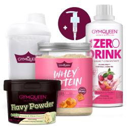 Summerbody Essentials GYMQUEEN. 1Wenn du, anstatt auf herkömmliche Desserts zurückzugreifen, deine Desserts mit den kalorienarmen Flavy Powders selbst zubereitest, kannst du dabei Zucker und Kalorien sparen. Ein konkretes Beispiel – Nährwerte im Vergleich: Herkömmlicher Stracciatella Joghurt (253 g) vs. Naturjoghurt 3,8 % Fett (250 g) mit 3 g Flavy Powder „Chunky Stracciatella“ Nährwerte Naturjoghurt mit Flavy Powder Herkömmlicher Stracciatella Joghurt Kalorien 186 kcal 278 kcal Fett 9,7 g 11 g davon gesättigte Fettsäuren 6,4 g 7,1 g Kohlenhydrate 13 g 38 g davon Zucker 13 g 35 g Ballaststoffe 1,7 g 0 g Eiweiß 11 g 7,8 g Salz 0,25 g 0,25 g Weitere Beispiele: Statt herkömmlichen Zucker im Kaffee oder in Gebäck kannst du auf deine Lieblingssorte Flavy Powder zurückgreifen. Der Zuckergehalt der Flavy Powder kann je Sorte variieren. 2Weniger als 4kcal bzw. 0,5g Zucker pro 100ml verzehrfertige Zubereitung Der Sommer steht vor der Tür! Um dich bei einer einfachen Routine für deinen Summer Body zu unterstützen, haben wir das Summer Body Essentials Bundle entworfen. Denn wir bei GYMQUEEN finden, dass ein Summer Body ein Körper ist, in dem du dich stark und wohlfühlst! Deshalb setzen wir auf Zuckerreduktion und eine erhöhte Proteinaufnahme. Unser Bundle enthält daher Whey Protein sowie unseren stylischen Shaker. Das Flavy Powder hilft dir, deine Lieblingsdesserts ganz einfach in kalorien- und zuckerreduziert kreieren!1 Abgerundet wird das Bundle durch mit B-Vitaminen angereicherten und zuckerfreien2 Zero Drink. Und on top gibt es Dosierspender gratis dazu!