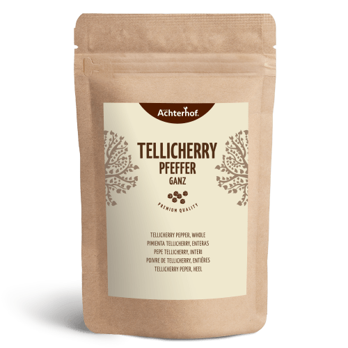 Tellicherry Pfeffer ganz vom Achterhof. Tellicherry Pfeffer kaufen: Bis zur Perfektion gereift Von der indischen Malabarküste stammt der exklusive Tellicherry Pfeffer. Eine besonders edle Pfeffersorte, die auf der ganzen Welt begehrt ist. Der 650 km lange Küstenabschnitt im Südwesten Indiens bietet dank des tropischen Klimas ideale Wachstumsbedingungen für verschiedene Gewürze. Auch Zimt und Ingwer werden hier angebaut. Und eben Pfeffer, der der Malabarküste den Beinamen Pfefferküste einbrachte. Unter den kostbaren Gewächsen ist auch der Tellicherry Pfeffer, der ein echter König unter den Pfeffersorten ist. Farblich erinnert er an den schwarzen Pfeffer, reift aber länger als alle anderen Pfefferbeeren. Diese Spezialität wird nicht unreif geerntet. Die Tellicherry Beeren bleiben bis zur völligen Reife am Pfefferstrauch, werden dann per Hand geerntet und getrocknet. Am Ende dieses Prozesses ist der Tellicherry Pfeffer goldbraun und beeindruckend aromatisch. Als echter Spätlese-Pfeffer glänzt er mit einer präzisen Schärfe und einem warmen, vollmundigen Aroma. Sein Duft ist intensiv und mit deutlich nussigen Noten gespickt. Wärmer aber auch kräftiger als schwarzer Pfeffer, lieben Spitzenköche auf der ganzen Welt dieses feine Gewächs. Nur die dicksten Pfefferbeeren kommen in den Verkauf – Tellicherry Pfeffer ist ohne Kompromisse ein rundum hochwertiges Spitzengewürz. Tellicherry Pfeffer in der Küche Fragst du dich nun, was du mit dieser Rarität unter den Pfeffersorten anfangen kannst? Grundsätzlich verwendest du Tellicherry Pfeffer wie schwarzen Pfeffer. Dennoch hat er ein anderes Aroma und verleiht deinen Speisen eine neue Geschmacksnote. Die Würze erinnert an Wald und Sonne, hat leicht florale Nuancen und eine angenehme Schärfe. Der Spätlese-Pfeffer harmoniert ausgezeichnet mit intensiven, fruchtigen Aromen wie Wacholderbeeren. Deftige Wildgerichte mit einem süßen Anteil profitieren vom Einsatz des Tellicherry Pfeffers. Dank seines Reifegrades enthält er eine wohltuende Süße, während das Piperin für die Schärfe verantwortlich ist. Gemeinsam eine bombastische Kombination. Auch als Einzelgewürz überzeugt dieser Pfeffer. Ein Dessert mit Erdbeeren, Mango oder Mandarinen gewinnt an Substanz, wenn eine Prise frisch gemahlener Tellicherry dazukommt. Und feine Soßen lieben dieses Gewürz sowieso. Keine Frage, mit diesem Produkt erwirbst du einen exklusiven Schatz für dein Gewürzregal. Einen edlen Pfeffer für feine Rezepte. Wie du die Pfefferkörner verwendest, bleibt dabei dir überlassen. Du kannst sie mitköcheln lassen und vor dem Servieren entfernen. Oder du mahlst den Tellicherry Pfeffer frisch in der Pfeffermühle. Auch ein Zerstoßen im Mörser ist möglich. Wenn du einen Pfeffer suchst, der nicht nur scharf, sondern auch aromatisch ist, sprechen wir für diesen eine klare Empfehlung aus. Im Laden wirst du ihn selten finden – online kannst du Tellicherry Pfeffer gleich bei uns bestellen. Wir schicken ihn dir sorgfältig verpackt nach Hause. Gönn‘ dir die Exklusivität von der indischen Pfefferküste! Der Tellicherry Pfeffer ist ein ganz besonders edler Pfeffer von der indischen Malabarküste, der im Gegensatz zum normalen schwarzen Pfeffer nicht unreif, sondern erst kurz bevor die Beeren anfangen zu reifen geerntet wird. Dadurch bekommt er ein deutlich wärmeres, kräftigeres und auch schärferes Aroma, das mit ein leicht nussigen Note überzeugt. Damit passt er ideal zu indischen Speisen, Saucen, Fleisch, aber auch als dezentes Topping von Desserts. Schon gewusst – das Produkt gibt es auch in Bio-Qualität .