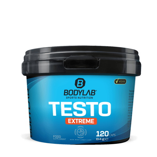 Testo Extreme Kapseln von Bodylab24. Die neue Unterstützung für Dein Training und Deine sportliche Performance – Testo Extreme Kapseln – mit verschiedenen Pflanzenextrakten, Vitaminen und Zink Warum Testo Extreme Kapseln und welche Inhaltsstoffe sind enthalten? In den Kapseln sind je Tagesdosis an Pflanzenextrakten 600mg Bockshornklee Extrakt (Fenugreek), 180mg Tribulus Terrestris Extrakt und 200mg Ashwagandha Extrakt enthalten. Kombiniert sind drei Vitamine – A, E und C und 30mg Zink. Ein paar kurze Infos zur den enthaltenen Inhaltsstoffen: Zink, ein für den gesamten Stoffwechsel wichtiges Spurenelement, trägt unter anderem zur Aufrechterhaltung eines normalen Testosteronspiegels bei und unterstützt die Proteinsynthese, ist wichtig für das Immunsystem und für die Sehkraft, die Knochen, Haut und Haare. Ebenso wie die Vitamine A, C und E gilt Zink als Antioxidans, das die normale Funktion des Immunsystems unterstützt und am Zellschutz vor oxidativem Stress beteiligt ist. Ausreichend Vitamin C wird unter anderem auch für den Energiestoffwechsel benötigt. Tribulus Terrestris ist bei zahlreichen Bodybuildern und Kraftsportlern ein beliebtes Supplement und wird von Bodylab auch als Einzelprodukt in Kapselform angeboten. Mit den Testo Extreme Kapseln erhältst Du ein bestens kombiniertes Produkt, das neben den Vorzügen und dem Saponingehalt des Tribulus Terrestris auch Saponine aus Bockshornklee (Fenugreek) Extrakt enthält, die sich optimal ergänzen. Ashwagandha rundet das Produkt ab. Du hast bis jetzt nur Tribulus Terrestris getestet? Dann lass Dich von der Wirkung der neuen Testo Extreme Kapseln und ihrer Wirkstoffkombination überzeugen. Wann und wie wird Testo Extreme verwendet? Nutze die Testo Extreme Kapseln in intensiven und harten Trainingsphasen zur Unterstützung Deiner sportlichen Performance. Da sie keine weiteren Nährstoffe enthalten, hängt der Erfolg und Nutzen des Trainings und der verwendeten Zusatzsupplements jedoch maßgeblich von Deiner ausgewogenen, gesunden und auf das Training und das Trainingsziel hin abgestimmten Ernährung und dem richtigen Trainingsprogramm ab. KURZINFO: Das MHD und die Chargennummer befinden sich unterhalb des Deckels auf der Dose. Bodylab Testo Extreme Kapseln. Die Kapseln enthalten eine Kombination aus Bockshornklee-, Tribulus Terrestris und Ashwaghandha-Extrakt, den Vitaminen A, E und C sowie Zink. Die Tagesdosis umfasst 2 Kapseln.