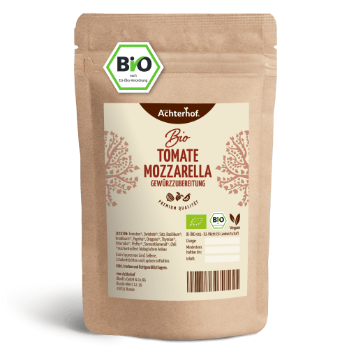 Tomate Mozzarella Gewürzzubereitung Bio vom Achterhof. Caprese extrafein: Mit der Tomate Mozzarella Gewürzzubereitung vom Achterhof Tomaten, Mozzarella und Basilikum, die klassischen Zutaten eines Tomate Mozzarella Caprese Salates. Und unbestritten sehr lecker. Tomate Mozzarella geht aber auch anders. Suchst du eine Abwechslung zum traditionellen Tomate Mozzarella Salat? Dann probiere doch mal unser Caprese Zucchini Rezept aus. Unser leichtes Caprese-Gratin besteht aus rein vegetarischen Zutaten, ist ein perfektes Gericht für laue Sommerabende. Für 4 Portionen benötigst du: 2 mittelgroße Bio Zucchini, 180 ml Olivenöl, 3 Kugel (Büffel) -Mozzarella, 8 Tomaten, 2 Zitronen, 3 Zehen vom Achterhof Schwarzer Knoblauch, ½ Bd. Bio Basilikum, vom Acherhof Bio Tomate Mozzarella Gewürzmischung. Und so einfach geht’s: Zucchini längs in Streifen schneiden. Etwas Olivenöl in der Pfanne erhitzen und die Zucchini kurz darin braten. Mozzarella abtropfen lassen. Tomaten waschen, putzen und mit Mozzarella in Scheiben schneiden. Abwechselnd mit den Zucchini in eine große Auflaufform schichten. Öl, Zitrone schwarzer Knoblauch und vom Achterhof Bio Tomate Mozzarella Gewürzmischung zu einem Dressing vermischen und gleichmäßig über den belegten Zucchinis verteilen. Caprese-Gratin für 6 Minuten bei 180 Grad im Ofen garen. Basilikumblätter zupfen, abwaschen und den fertigen Auflauf damit garnieren. Erlesene Zutaten-Kombination in bester Bio Qualität Bei vom Achterhof findest du nicht nur liebevoll zusammengestellte Gewürzkompositionen, sondern auch die Zutaten in bester Qualität. Wann immer es uns möglich ist, versuchen wir unsere Zutaten in Bio-Qualität zu bekommen, denn Geschmack und Premiumqualität sind unser höchster Anspruch. Eco control number: DE-ÖKO-001 Caprese ist der Inbegriff für Bella Italia, der ursprünglich aus der Gegend um Capri kommt. Tomaten, Mozzarella und Basilikum. Mit nur drei Zutaten und unserer beliebten Tomaten Mozzarella Gewürzmischung in Bio Qualität wird die beliebte Vorspeise zu einem wahren Hochgenuss. Doch nicht nur als Vorspeise hat sich die beliebte Tomate-Mozzarella Kombination durchgesetzt. Auch als Brotaufstrich, Pasta-Variante, Pizzabelag, Caprese-Sandwich, oder als Ravioli-Füllung verfeinert das frisch-tomatige Aroma unsere Speisen.