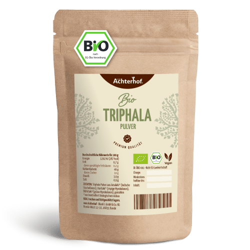Triphala Pulver Bio vom Achterhof. Triphala Pulver BIO : die drei starken Argumente des Ayurvedas Ayurvedische Dreifrucht Kombination Beim BIO Triphala Pulver handelt es sich um ein Kombinationsprodukt aus drei verschiedenen Pflanzen, die in der indischen Lehre des Ayurvedas sehr geschätzt sind. Das Zusammenspiel von Amalaki, Bibhitaki und Haritaki macht das BIO Triphala Pulver zu einer Kräutermischung der ganz besonderen Art. Jedem Bestandteil für sich werden im Ayurveda positive Eigenschaften zugesprochen. Kombiniert erhältst du drei unschlagbare Argumente für Ayurveda und eine Einladung, dieses für dich zu entdecken. Gerade die drei Komponenten dieser Mischung sehen die alten Lehrmeister Indiens als besonders vielversprechend an. Die Anwendung funktioniert ganz einfach. Ein Teelöffel BIO Triphala Pulver täglich auf eine Tasse Wasser oder auch Orangensaft, umrühren, trinken, fertig. Praxisnahe Ayurveda für den Alltag sieht genau so aus. Triphala und die Doshas Im Ayurveda spricht man von drei Doshas, zu denen jeder Mensch ganz oder in Teilen gehört. Besonders sensible, unruhige und sehr zarte Menschen entsprechen beispielsweise dem Dosha Vata, wohingegen athletische Perfektionisten mit einem Drang zum heißen Kopf Pitta-Typen sind. Das dritte Dosha, Kapha, umfasst antriebsschwache, melancholische und körperlich eher stärker gebaute Menschen. Jedem tut nun etwas anderes gut. Triphala als Kräutermischung jedoch, beinhaltet für jeden Dosha-Typen wichtige Elemente, eignet sich also unabhängig davon, zu welchem Dosha jemand gehört. Im BIO Triphala Pulver finden sich Anteile, die für jeden Dosha-Typen interessant sein sollen. Entdecke diese Mischung, die zurecht als Allrounder des Ayurvedas bezeichnet werden kann, und bestelle dir BIO Triphala Pulver in höchster Qualität bequem online. Eco control number: DE-ÖKO-001 Das Bio-Triphala Pulver, oder auch Rasayana genannt, ist, wie der Name schon verrät, eine Mischung aus drei verschiedenen Früchten in Pulverform. Die Kombination aus Amalaki, Bihitaki und Haritaki ist eine Kräutermischung, die im Ayurveda viele positive Eigenschaften mit sich bringt. Die Anwendung ist vielseitig möglich: einfach einen Teelöffel der Kräuterpulvermischung in dein Wasser, deinen Saft oder Smoothie rühren.