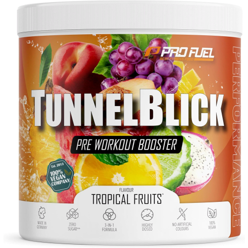 Tunnelblick Pulver von ProFuel mit Tropical Fruits Geschmack in der 0.44KG Packung. Erlebe intensivere Workouts mit dem neuen Tunnelblick Pre-Workout Booster. Mit einer fortschrittlichen 3-in-1 Formel aus hochdosierten Aminosäuren, wertvollen Pflanzenextrakten, Koffein und Guarana unterstützt dich dieser Booster optimal beim Training. Die Zusammensetzung basiert auf wissenschaftlichen Studien und enthält hochwertige Inhaltsstoffe wie L-Citrullin, Arginin, Taurin, und Rhodiola Rosea. Zudem überzeugt der Tunneblick Booster mit einem unvergleichlich leckeren Geschmack, erhältlich in 4 abwechslungsreichen Sorten. Hergestellt in Deutschland, vegan und laborgeprüft für beste Qualität – dein idealer Begleiter für ein erfolgreiches Workout.