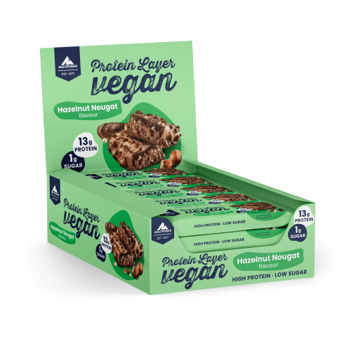 Vegan Protein Layer Riegel von Multipower mit Hazel Nougat Geschmack in der 0.825KG Packung. Vegan Protein Layer von Multipower Die unterschiedlichen Schichten des Protein Layer machen diesen zu einem köstlichen Proteinriegel und einer leckeren Alternative zur Deckung des täglichen Proteinbedarfs. Neben seinem einzigartig leckeren Geschmack besitzt er einen hohen Proteinanteil von 30 % und ist zudem zuckerarm. Damit ist der Proteinriegel der perfekte Snack für zwischendurch. Entdecke die pflanzliche Power mit dem Vegan Protein Layer von Multipower – der perfekte Riegel für alle, die Wert auf Geschmack und Nachhaltigkeit legen. Mit 24 % hochwertigem pflanzlichem Protein aus Soja, Erbsen und Reis versorgt er deinen Körper effizient und natürlich mit wichtigen Nährstoffen – ideal für aktive Menschen und alle, die bewusst snacken möchten. Trotz seiner intensiven Süße enthält der Riegel nur 1 % Zucker und überzeugt mit einem vollmundigen Geschmack, der durch eine zartschmelzende Schokoladenschicht abgerundet wird. Ob als Snack für unterwegs oder als Belohnung nach dem Workout – der Vegan Protein Layer passt in jeden Alltag.