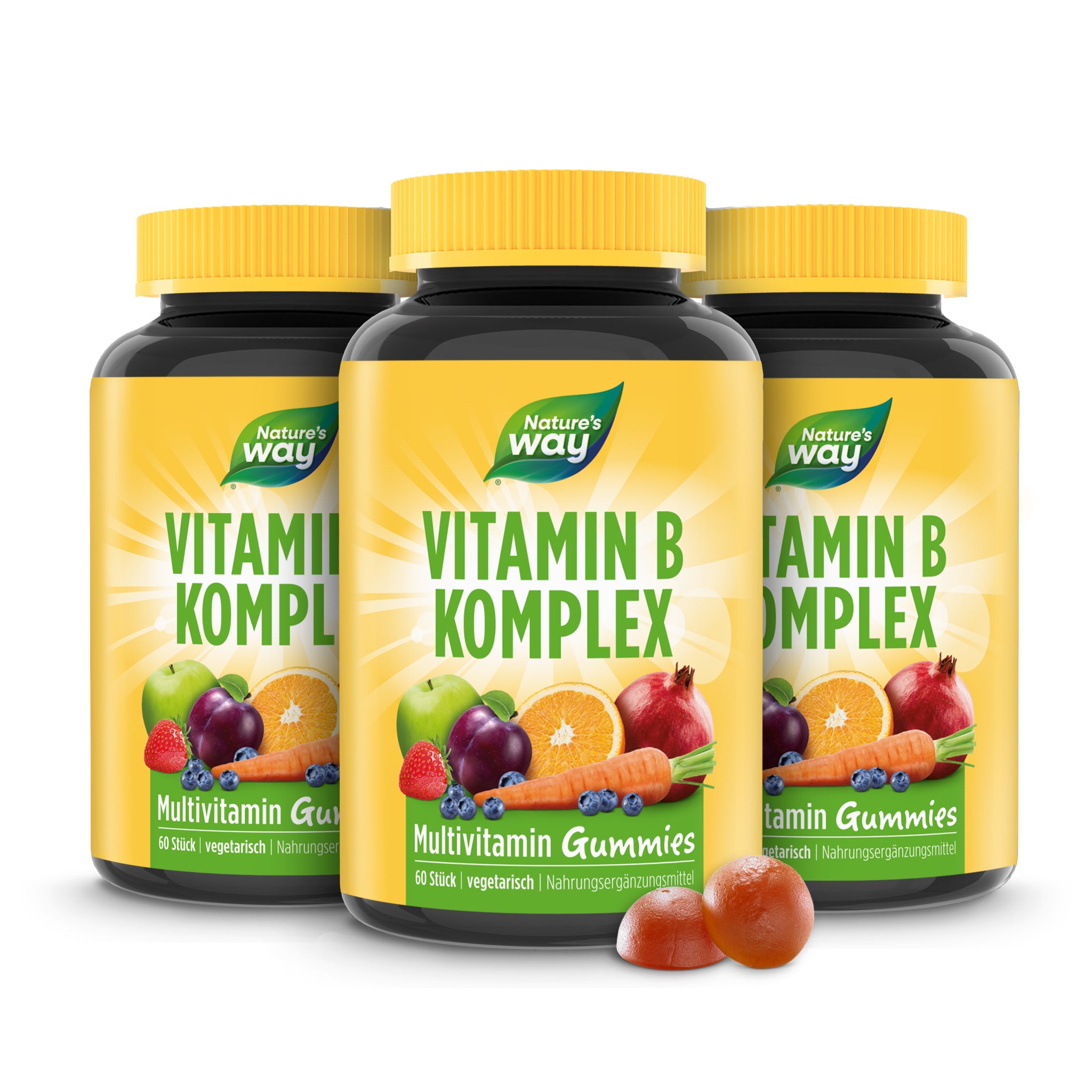 Egal ob am Schreibtisch oder beim Sport, ausreichend Energie und starke Nerven sind im beschäftigten Alltag wichtig. 1-2 Vitamin B Komplex Multivitamin Gummies täglich versorgen dich auf unkomplizierte Art mit allen 8 B-Vitaminen, darunter einer Extraportion B6 & B12 für Energie und Nervenstärke.¹² In den Vitamin-Gummibärchen stecken die Vitamine B1, B2, B3, B5, Biotin (B7), Folsäure (B9), B12, Vitamin C und das natürliche Plus aus 26 Obst- und Gemüsesorten. Dank Vitamin B5 behältst du die volle Konzentration und Fokus im Alltag⁴, B6 & B12 sorgen für einen normalen Energiestoffwechsel und helfen bei Müdigkeit und Ermüdung.¹³ Vitamin B2 und B3 sorgen für die normale Funktion des Nervensystems.⁵ On top bekommt dein Immunsystem mit Vitamin C und Folsäure Unterstützung.⁶. – 60 Vitamin B Komplex Gummies mit Mango-Geschmack. – Alle 8 B-Vitamine: B1, B2, B3, B5, B6, Biotin, Folsäure & B12. – Mit dem Plus aus 26 Obst- und Gemüsesorten. – Vitamin C für dein Immunsystem⁶. – Vegetarisch und frei von Gelatine, Gluten und Laktose. ¹Vitamin B6 und B12 tragen zu einem normalen Energiestoffwechsel bei. ²Vitamin B6 und B12 tragen zu einer normalen Funktion des Nervensystems bei. ³Vitamin B6 und B12 tragen zur Verringerung von Müdigkeit und Ermüdung bei. ⁴Vitamin B5 trägt zu einer normalen geistigen Leistung bei. ⁵Vitamin B2 und B3 tragen zu einer normalen Funktion des Nervensystems bei. ⁶Vitamin C und Folsäure tragen zu einer normalen Funktion des Immunsystems bei
