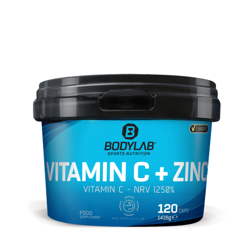 Vitamin C + Zinc Kapseln von Bodylab24. Vitamin C + Zinc – der Vitamin C-Boost* in der praktischen Kapselform Vitamin C*, eines der bekanntesten Vitamine und für unser Immunsystem und zahlreiche andere Prozesse des Körpers essenziell. Klassische und natürliche Lieferanten sind Zitronen, Orangen, Erdbeeren, Kirschen und weitere Früchte, die Hagebutte und auch verschiedene Gemüsesorten wie Paprika und Brokkoli. Zink** zählt zu den Spurenelement und ist für den Körper ebenfalls essenziell. Es ist in unsere normalen Nahrung z.B. in Rindfleisch, Garnelen, Austern, Emmentaler, Gouda, Eigelb, Haferflocken, Linsen, Mais, Sonnenblumenkernen oder Leinsamen enthalten. Da hier ein hoher Anteil an nicht veganen Lebensmitteln zu finden ist, müssen besonders Veganer auf eine ausreichende Versorgung achten und evtl. zu einem Nahrungsergänzungsmittel greifen. Unsere Vitamin C + Zink Kapseln haben eine Kapselhülle aus Hydroxypropylmethylcellulose und sind 100% vegan. Es sind keine Trennmittel, Aromen, Farbstoffe, Stabilisatoren, Konservierungsstoffe oder Gelatine enthalten. Zur Nutzung bei hohen körperlichen Belastungen, z.B. durch intensive und fordernde Trainingseinheiten. Mehr Infos zu Vitamin C und Zink: *Vitamin C trägt dazu bei, die Zellen vor oxidativem Stress zu schützen. Vitamin C trägt zur Verringerung von Müdigkeit und Ermüdung bei. Vitamin C trägt zu einer normalen Funktion des Immunsystems bei. Vitamin C trägt zu einem normalen Energiestoffwechsel bei. Vitamin C trägt zu einer normalen Funktion des Nervensystems bei. Vitamin C trägt zu einer normalen Kollagenbildung für eine normale Funktion der Blutgefäße bei. Vitamin C trägt zu einer normalen Kollagenbildung für eine normale Funktion der Knochen bei. Vitamin C trägt zu einer normalen Kollagenbildung für eine normale Knorpelfunktion bei. Vitamin C trägt zu einer normalen Kollagenbildung für eine normale Funktion der Haut bei. Vitamin C trägt zu einer normalen Kollagenbildung für eine normale Funktion des Zahnfleisches bei. Vitamin C trägt zu einer normalen Kollagenbildung für eine normale Funktion der Zähne bei. **Zink trägt zur Erhaltung normaler Haare bei. Zink trägt zur Erhaltung normaler Nägel bei. Zink trägt zur Erhaltung normaler Haut bei. Zink trägt zu einem normalen Kohlenhydrat-Stoffwechsel bei. Zink trägt zu einer normalen kognitiven Funktion bei. Zink trägt zu einer normalen DNA-Synthese bei. Zink trägt zu einer normalen Fruchtbarkeit und einer normalen Reproduktion bei. Zink trägt zu einem normalen Stoffwechsel von Makronährstoffen bei. Zink trägt zu einem normalen Fettsäurestoffwechsel bei. Zink trägt zu einem normalen Vitamin-A-Stoffwechsel bei. Zink trägt zu einer normalen Eiweißsynthese bei. Zink trägt zur Erhaltung eines normalen Testosteronspiegels im Blut bei. Zink trägt zur Erhaltung normaler Sehkraft bei. Zink trägt zu einer normalen Funktion des Immunsystems bei. Zink trägt dazu bei, die Zellen vor oxidativem Stress zu schützen. Zink hat eine Funktion bei der Zellteilung. Dein Supplement für ein starkes Immunsystem* mit Vitamin C + Zinc. Enthalten ist 1000 mg Vitamin C, angereichert mit 15 mg Zink. Ideal als hochdosierte Nahrungsergänzung in der kalten Jahreszeit oder bei intensiver sportlicher und/oder körperlicher Betätigung. * Vitamin C und Zink tragen zu einer normalen Funktion des Immunsystems bei.