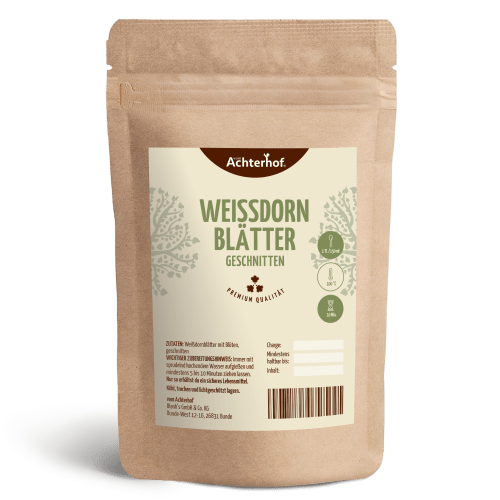 Weißdornblätter mit Blüten geschnitten vom Achterhof. Weißdornblätter mit Blüten – wärmende Tees die Lust auf mehr machen Hildegard von Bingen hat die Weißdornblätter bereits im Mittelalter eingesetzt und ein Gebräu zubereitet, das sie selbst Herzwein nannte. Dazu nutzte sie sowohl die getrockneten Blätter als auch die Blüten und legte sie in Alkohol ein. Weißdornblätter mit Blüten duften im getrockneten Zustand sehr angenehm und muten leicht süßlich an. Der Geschmack hingegen lässt eine leichte Bitterkeit nicht überspielen, wodurch Du den Tee am besten mit Honig süßt um ihn ohne bitteren Beigeschmack genießen kannst. Der Weißdorn, auch als Heinzelmännerchen bekannt, fällt am Wegesrand vor allem durch seine strahlend weißen Frühlingsblüten und den darauffolgenden glänzenden roten Früchten auf. Die Weißdorn Mischung vom Achterhof ist eine Kombination aus Blättern und Blüten und eignet sich ideal zur Zubereitung eines süßlich duftenden, aber leicht bitter schmeckenden Tees. Schon gewusst – das Produkt gibt es auch in Bio-Qualität .