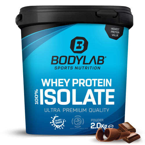 Whey Protein Isolat Pulver von Bodylab24 mit Schokolade Geschmack in der 2KG Packung. Whey Protein Isolat von Bodylab24 Der Name sagt alles: 100% pures Whey Protein Isolat von Bodylab24, mit einem Eiweißgehalt von bis zu 88% – das konzentrierteste Eiweiß überhaupt. Ein reines Isolat eignet sich für Wettkampfathleten oder während einer extremen Definitionsphase. Es enthält kaum Fett, Zucker und Laktose und wird schonend aus frischer Molke hergestellt. Whey Protein Isolat von Bodylab24 bietet jedem Kunden, der ein hochwertiges Isolat sucht, Super-Qualität zum nahezu halben Preis von qualitativ gleichwertigen Isolaten aus Amerika. Vorteile von Whey Protein Isolat Auch Whey Protein Isolat ist ein Molkenproteinprodukt und wird mittels Mikro- und Ultrafiltration auf einen Proteingehalt von bis zu 90% aus frischer Molke konzentriert. Für die Nutzung als Grundlage für Deinen Proteinshake wird es, in einem Instantisierungsprozess, getrocknet und dann zu einem feinen Pulver verarbeitet. Damit hat Whey Protein Isolat einen höheren Proteingehalt als herkömmliche Whey Proteine, der Fett und Laktosegehalt ist gering und bleibt unter 1%. Aufgrund der aufwendigeren Produktion ist das Produkt allerdings teurer als ein Whey Protein. Der Shake ist nicht ganz so cremig aber dennoch sehr gut löslich. Für den täglichen Gebrauch empfehlen wir daher eher ein klassisches Whey Protein von Bodylab24. Zur Wettkampfvorbereitung, in strengen Diätphasen oder auch bei Problemen mit der Verträglichkeit eines herkömmlichen Whey Protein Shakes hat reines Isolat jedoch Vorteile. Für welche Sportler eignet sich Whey Protein Isolat? Generell eignet sich Whey Protein Isolat für jeden Sportler. Insbesondere Profi-Bodybuilder oder Athleten, die regelmäßig an Wettkämpfen teilnehmen, nutzen Isolat aufgrund des hohen Protein- aber geringen Fettanteils. Außerdem eignet es sich für alle Sportler, die normales Whey Protein nicht gut vertragen, da der Laktosegehalt von Isolat sehr gering ist. Für beide Sorten gilt gleichermaßen – beste Premiumqualität aus hochwertigen Rohstoffen! Jetzt in neuem Design. Molke-Eiweiß-Isolat ohne Kompromisse – mit bis zu 88% Eiweißgehalt.