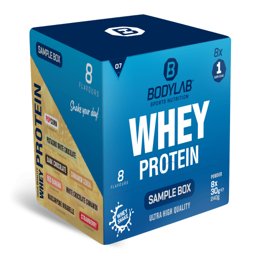 Whey Protein Probierbox 7 Pulver von Bodylab24. Unsere Whey Protein Probierboxen mit jeweils 8 x 30 g Whey Protein Teste jetzt verschiedene Geschmacksvarianten und finde Deinen Lieblingsgeschmack, nutze die Samples für die Reise und zwischendurch, rund ums Training und im Alltag. Die Probierboxen enthalten eine Mischung aus alten und neuen Geschmacksvarianten. Jede Portion (30 g) liefert mehr als 70% Eiweiß, ist reich an BCAA’s und bietet die Möglichkeit neue Geschmäcker zu testen und auszuprobieren. Die Boxen enthalten folgende Geschmacksvarianten: Box 1: Bourbon Vanilla, Chocolate-Coconut, Triple Chocolate, Erdbeer, Cookies & Cream, Stracciatella, Milchschokolade und Lemon Cheesecake. Box 2: Bourbon Vanille, Chocolate Coconut, Triple Chocolate, White Chocolate, Yoghurt Peach, Stracciatella, Milk Chocolate und Lemon Cheesecake. Box 3: Vanille, Banane, Himbeer-Joghurt, Pistazie, Butterkeks, Milchreis-Zimt, Haselnuss-Kakao und Erdbeer-Weiße Schokolade. Box 4: Chocolate Brownie, White Chocolate Cookie Crumble, Kirsch-Joghurt, Vanilla Cookie, Salty Caramel, Blaubeere, Caramell Cookie und Cookies and Cream. Box 5: Blueberry Muffin, Fruit Punch, Strawberry Chocolate Yoghurt, Coconut Cream, Chocolate Butterkeks, Vanilla Almond, Cinnamon Cereal Dark Chocolate und Chocolate Pistachio. Box 6: Marzipan, Toffee, Chocolate Mint, Cinnamon Cereal White Chocolate Crisp, Pannacotta, Banana Bread, Vanilla Ice Cream und Dark Cookie Crumble. Box 7: Cinnamon Cereal, Dark Chocolate, Popcorn, Red Banana, White Chocolate Pistachio, White Chocolate Cinnamon, Mascarpone Mirabelle und Erdbeere. Bestes Protein für Deinen Muskelaufbau und -erhalt Mehr Infos zu den einzelnen Geschmacksvarianten und den Inhaltsstoffen findest Du HIER oder HIER . Eine Whey-Test-Box für Dich – 8 Geschmacksvarianten zum Ausprobieren und Testen mit je 1 Portion (30g), Jede Probierbox enthält eine unterschiedliche Mischung aus alten und neuen Geschmacksvarianten. Jede Whey Portion liefert mehr als 70% Eiweißgehalt, ist reich an BCAAs, perfekt löslich und ideal zur Nutzung rund ums Training!