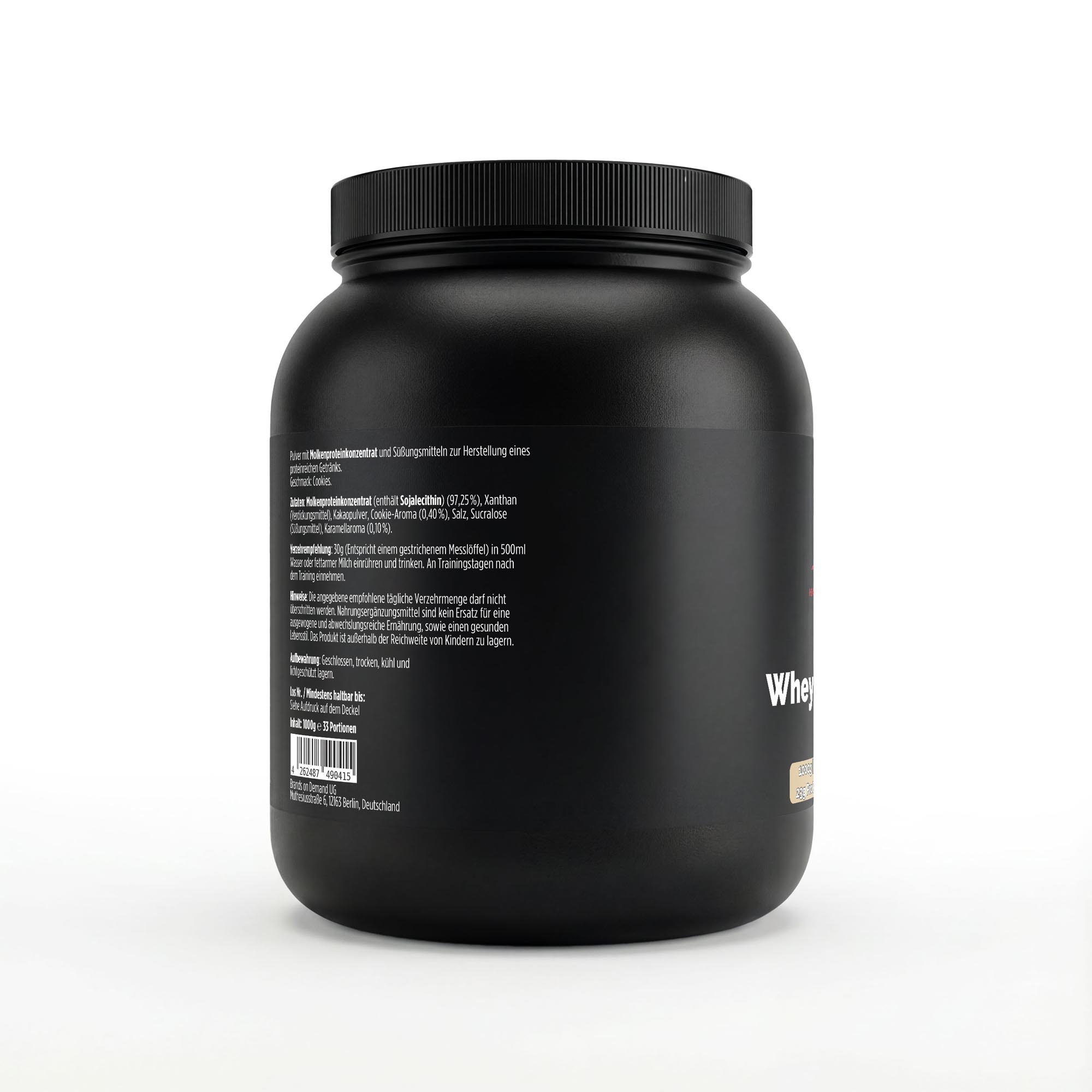 Molkenproteinkonzentrat (enthält Sojalecithin) (97,25 %), Xanthan (Verdickungsmittel), Kakaopulver, Cookie-Aroma (0,40 %), Salz, Sucralose (Süßungsmittel), Karamellaroma (0,10 %).